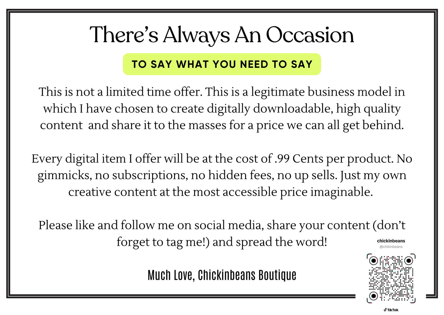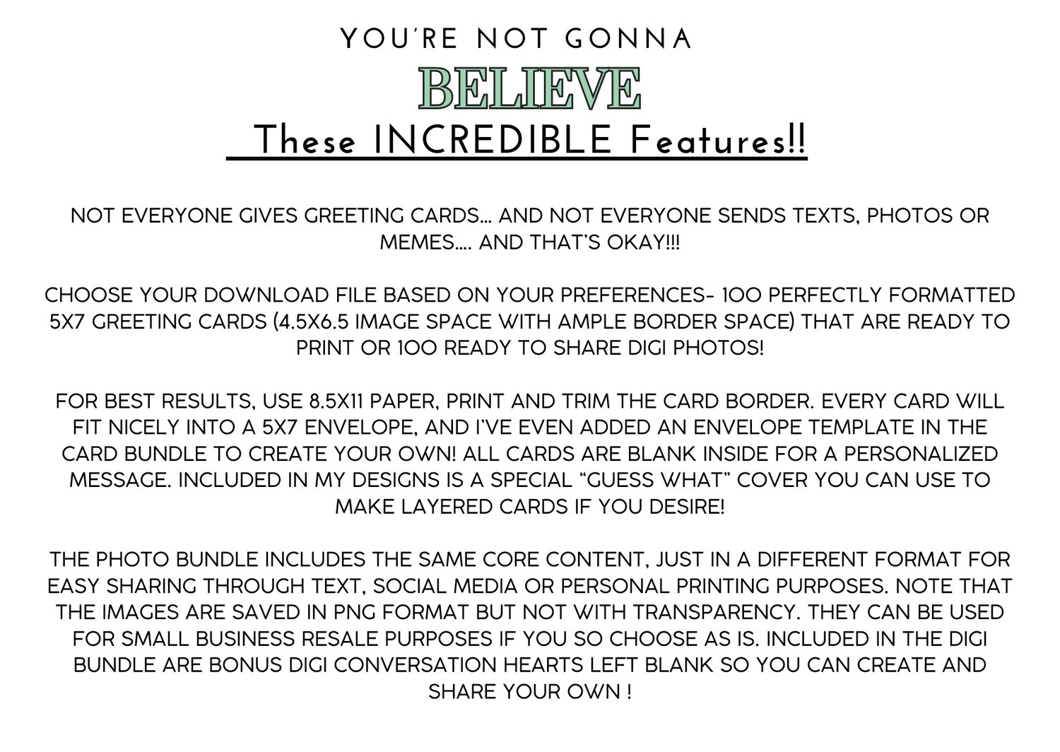 No tricks, scams or gimmicks- just 100% custom created designs formatted for social media sharing and texting at an unbelievable price. Say what you need to say all while having a fun way to say it!!!