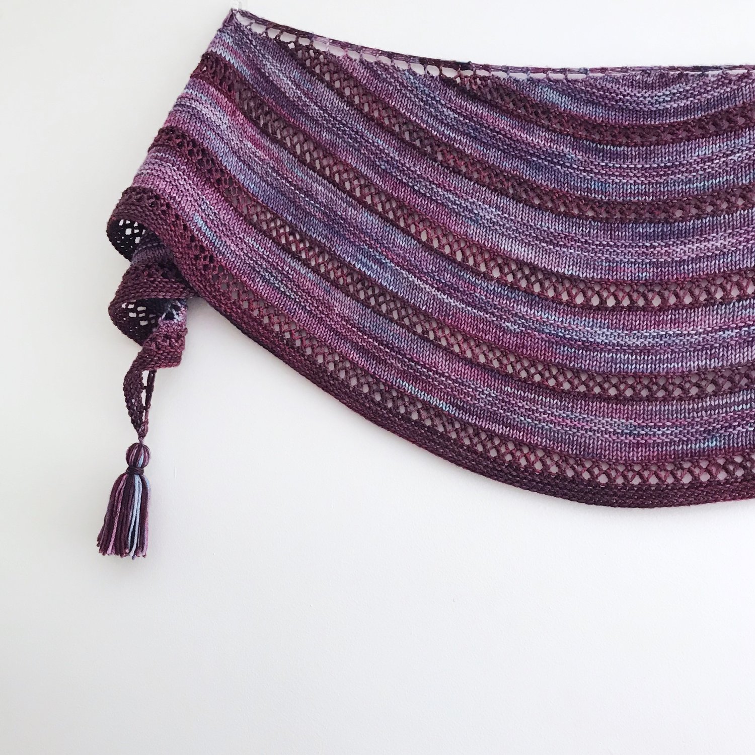 Zooming is a Worsted weight (10 ply) shawl inspired by the desire to have a relaxing project while connecting with crafty friends over Zoom. It is simple to knit while carrying on a conversation and with frequent section changes, you will find yourself relaxed and literally zooming through it (see what I did there :)). A little texture, some simple lace, endless colour options, and easy-to-customise sizing- this shawl is also an excellent way to bust your yarn stash.