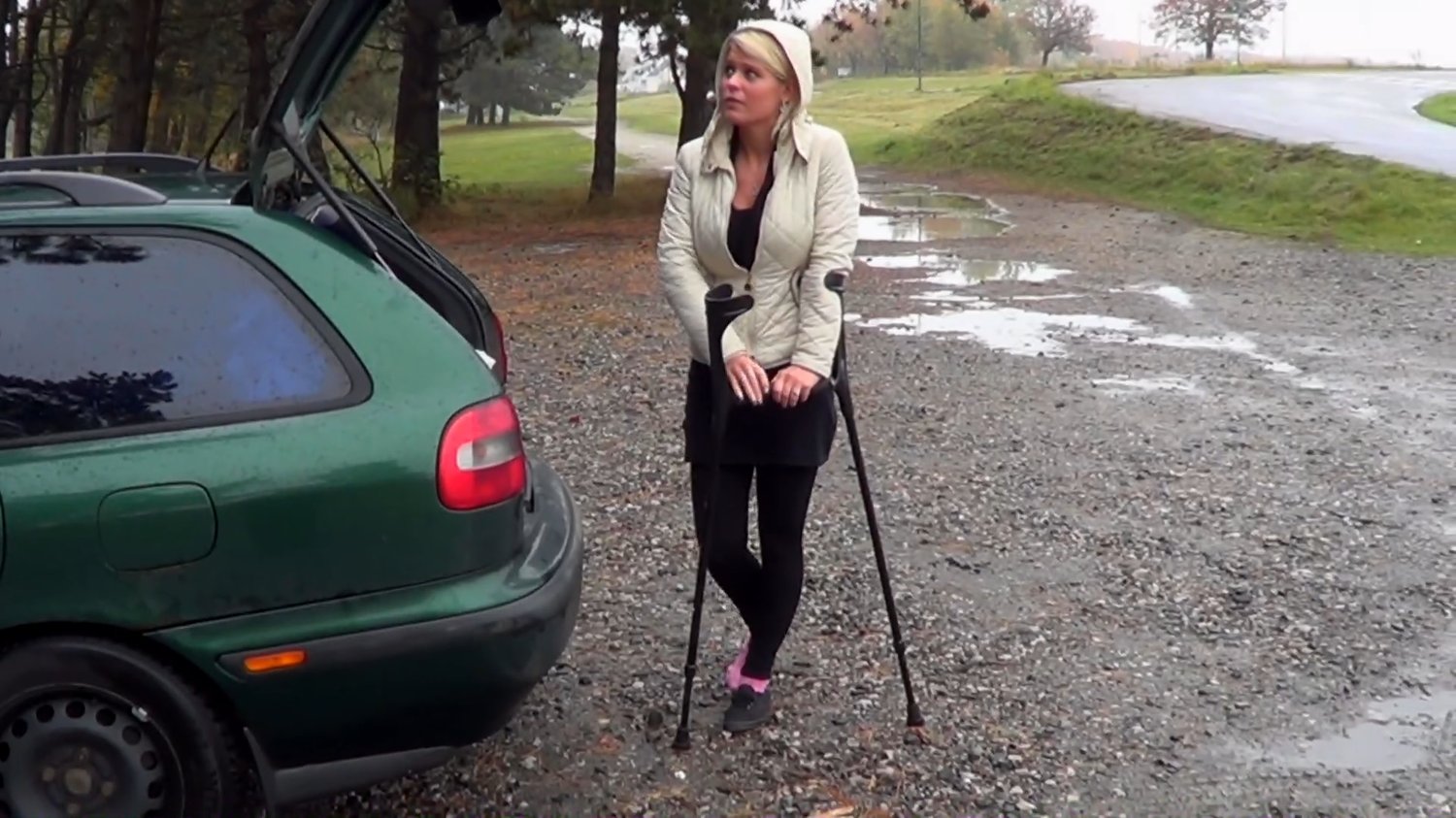 Ice jumps out from the car on one leg with a pink sock on her hurt right foot.She take her crutches from the trunk and start crutching holding her hurt foot in front of her.After a while one of her crutches breaks and she throws it away and starts jumping on one leg with the aid of her other crutch.