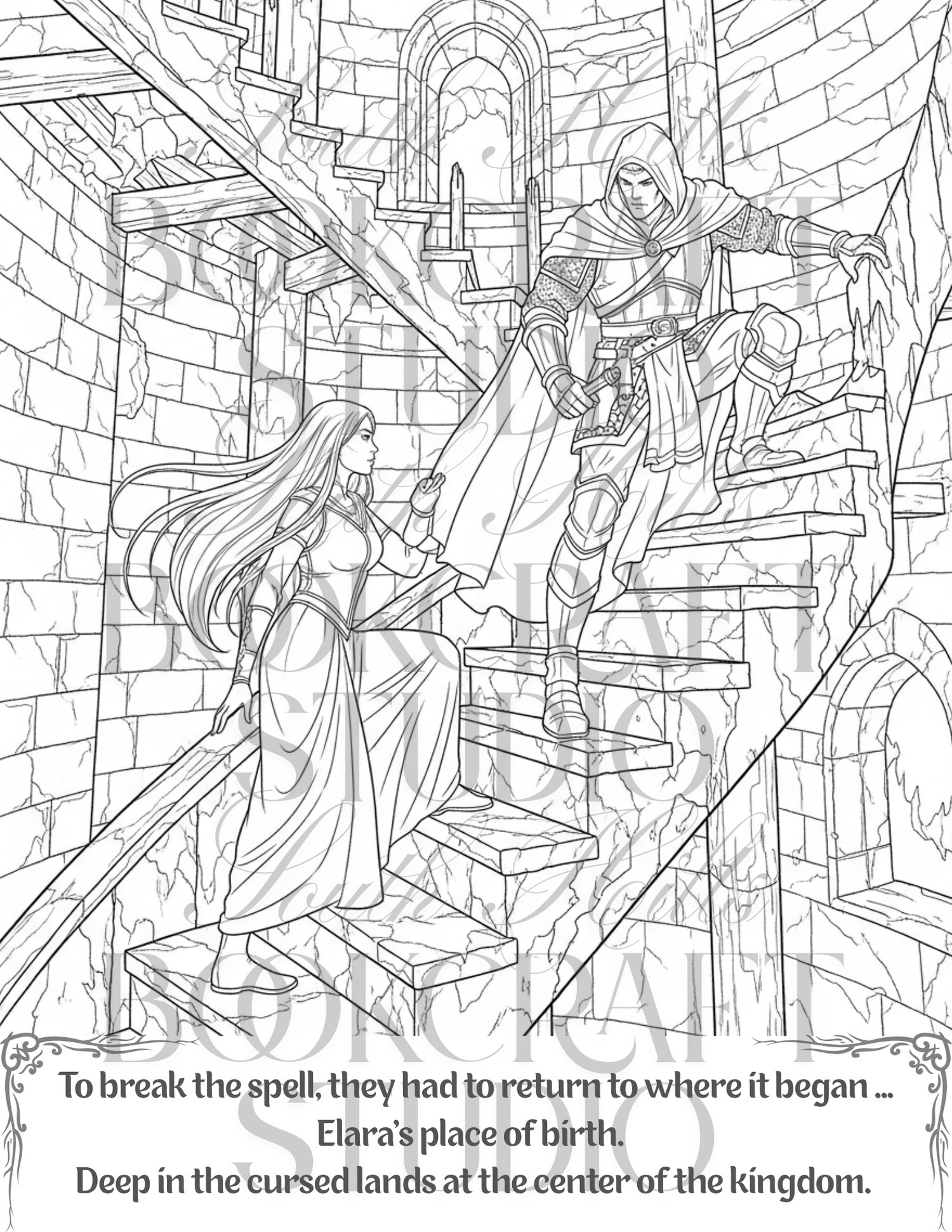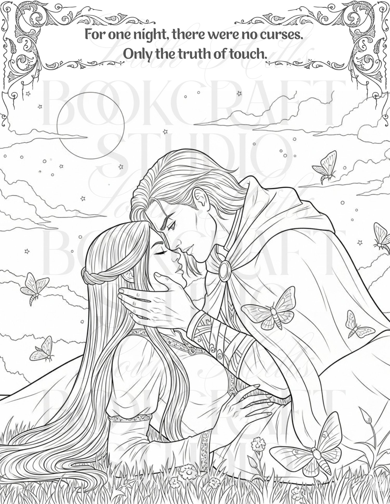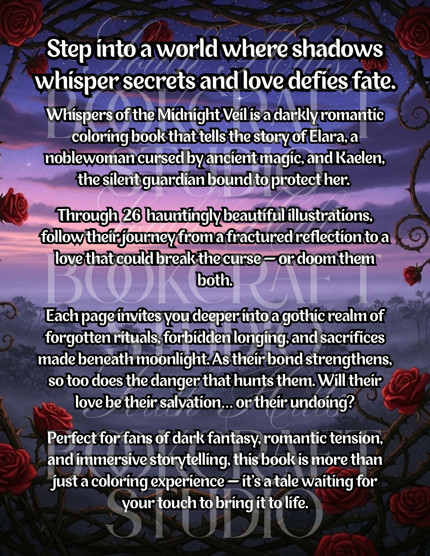 Whispers of the Midnight Veil is a romantic fantasy coloring book for adults, now beautifully printed at 5.5 x 8.5 inches—a perfectly portable size with the depth and detail you crave. This tale follows Elara, a noblewoman cursed by forgotten magic, and Kaelen, her sworn protector, across 26 intricately illustrated pages that blend fantasy, passion, and dark enchantment.