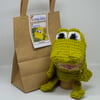 Frances Frog is made with machine washable acrylic DK. This means that you don't have to worry about him getting dirty because you can just put him in the washing machine.