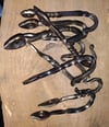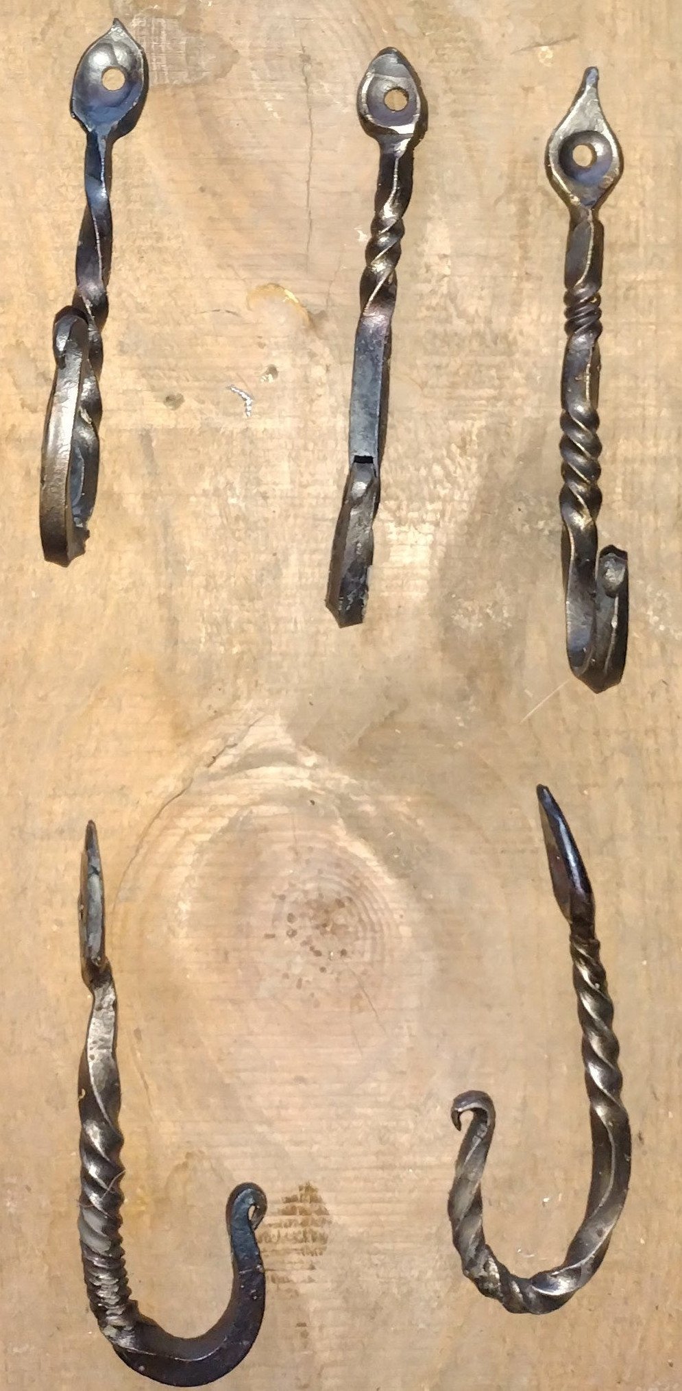 These rustic iron wall hooks are hand-forged from 1/4" rebar and finished in beeswax. They mount handsomely on any wall and will support a load of 20-30lbs. Suitable for coats, hats, pet leashes, backpacks, purses, kitchen or barbecue utensils, you name it!