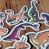 The stickers are printed on matte paper and then covered with a holographic vinyl foil. Please note: The stickers are *not* waterproof. Their surface is theoretically splash proof, but due to the handmade nature of the items I do not recommend submerging the stickers fully in water (e.g. in the dishwasher or running tap water), as any water potentially seeping through the uncovered edges of the stickers could wash out the inks underneath the vinyl surface.