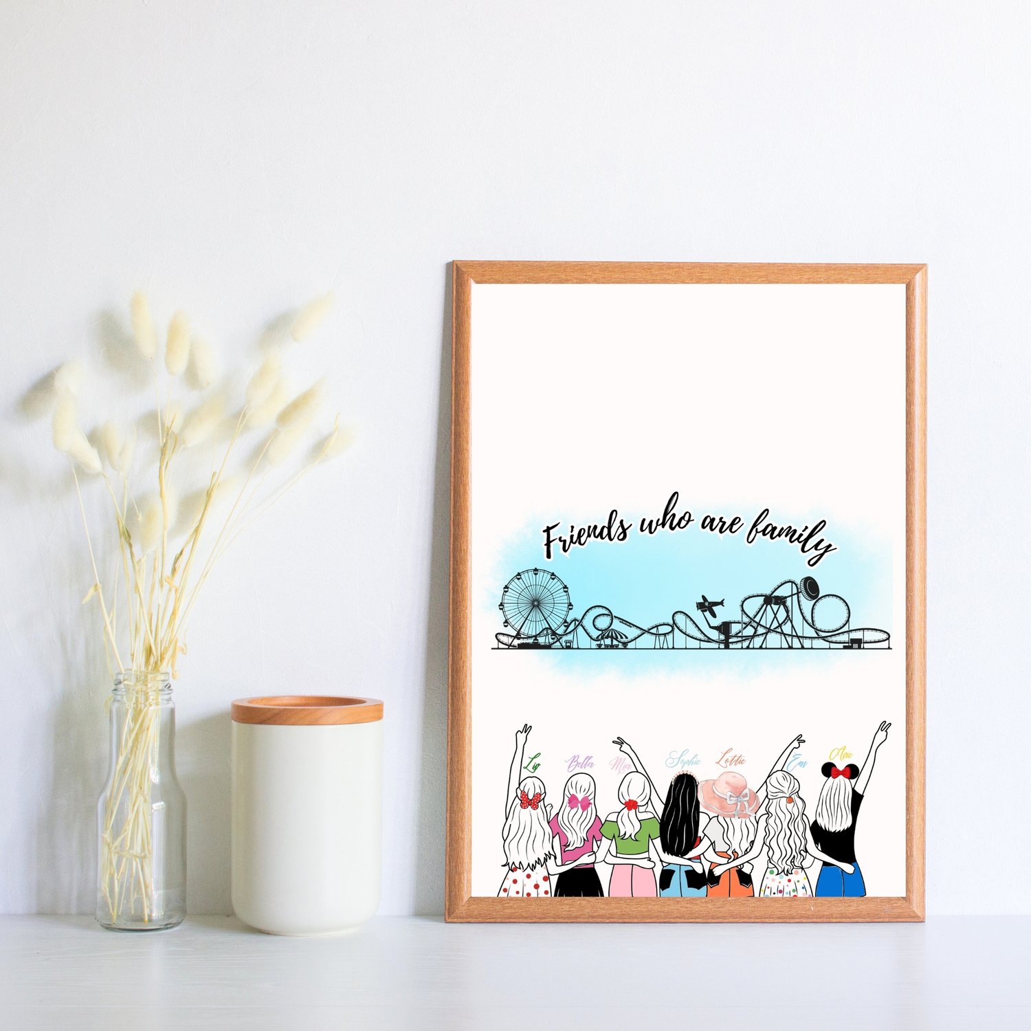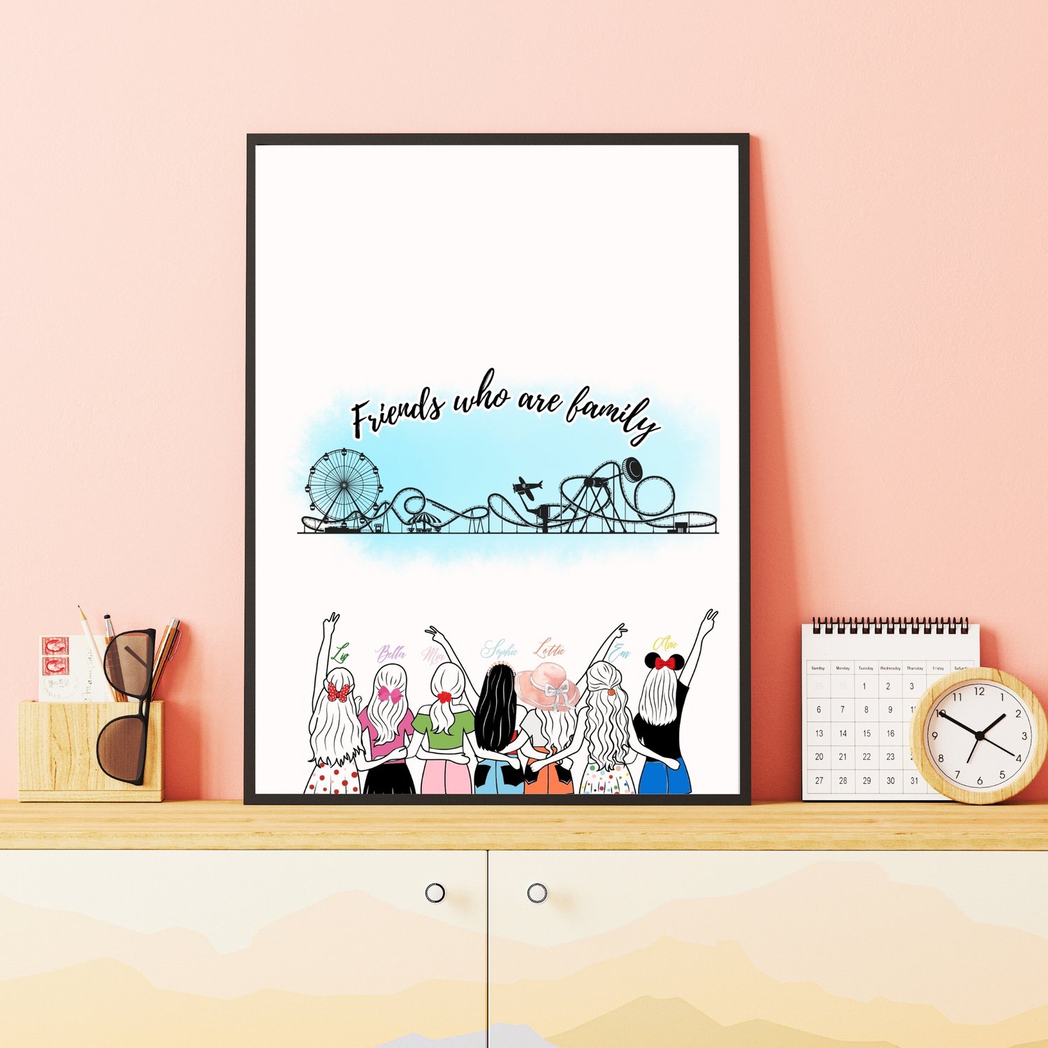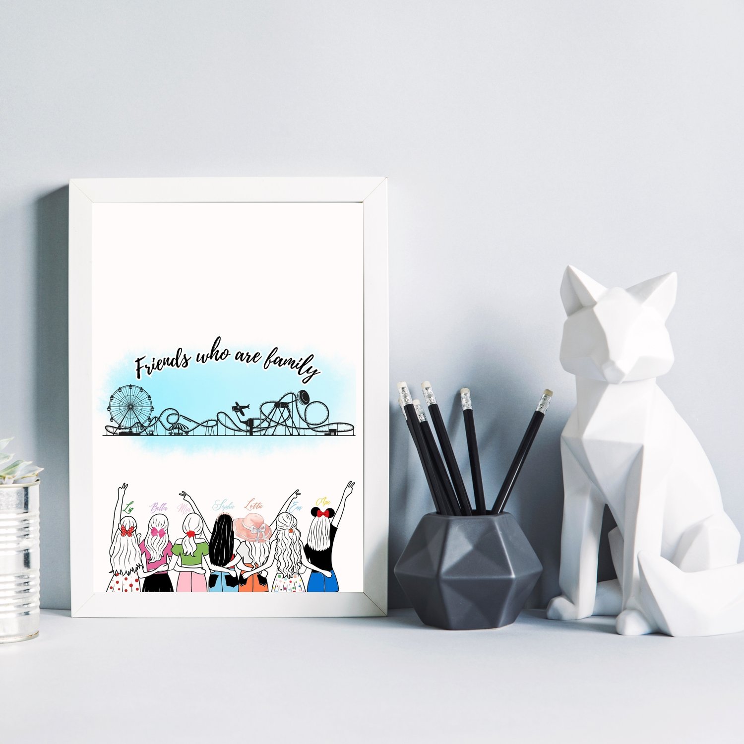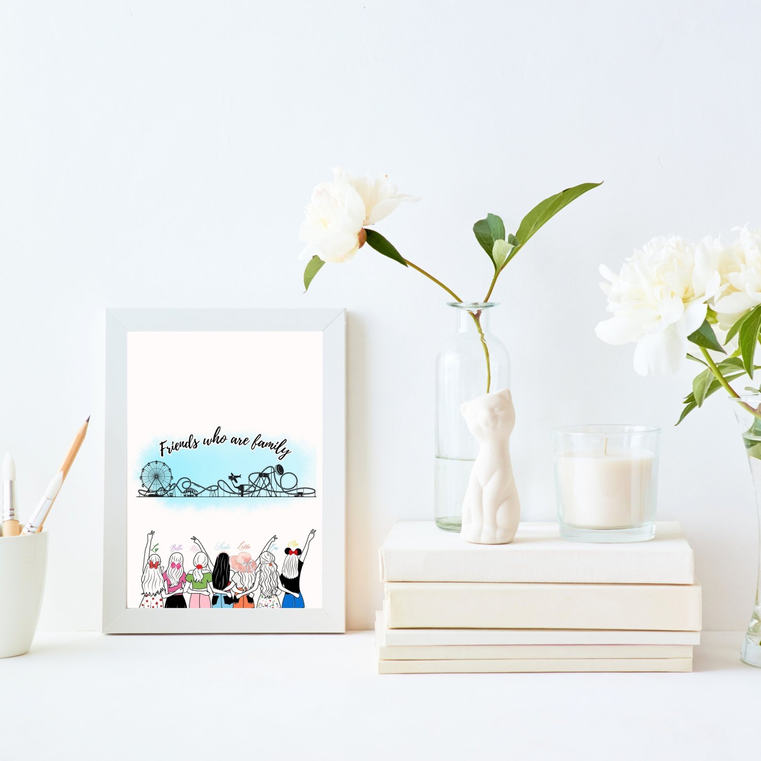 Celebrate the special bond you share with your best friends with this charming wall art titled "Friends Who Are Family." Featuring seven friends enjoying a fun day out, this illustration captures the joy and unity of true friendship. Customize this piece with your own names, nicknames, and even personal quotes to make it uniquely yours. Perfect for adding a touch of warmth and love to any room, this artwork is a beautiful reminder that friends truly are the family we choose.
