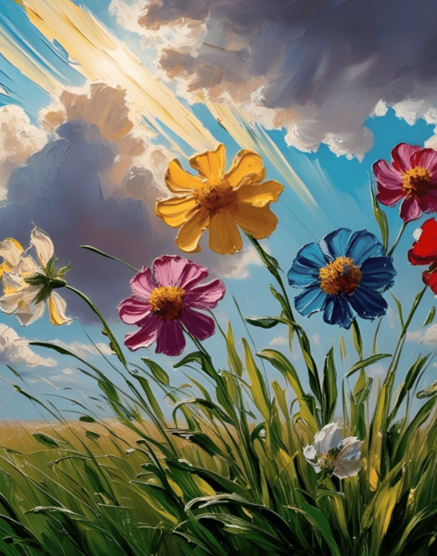Sunrise, Bunch Of wild Flower, Flower Field, White cloud Sky, Flower, Beautiful Flower, Wild Flower, Nature Love, Floral Art.