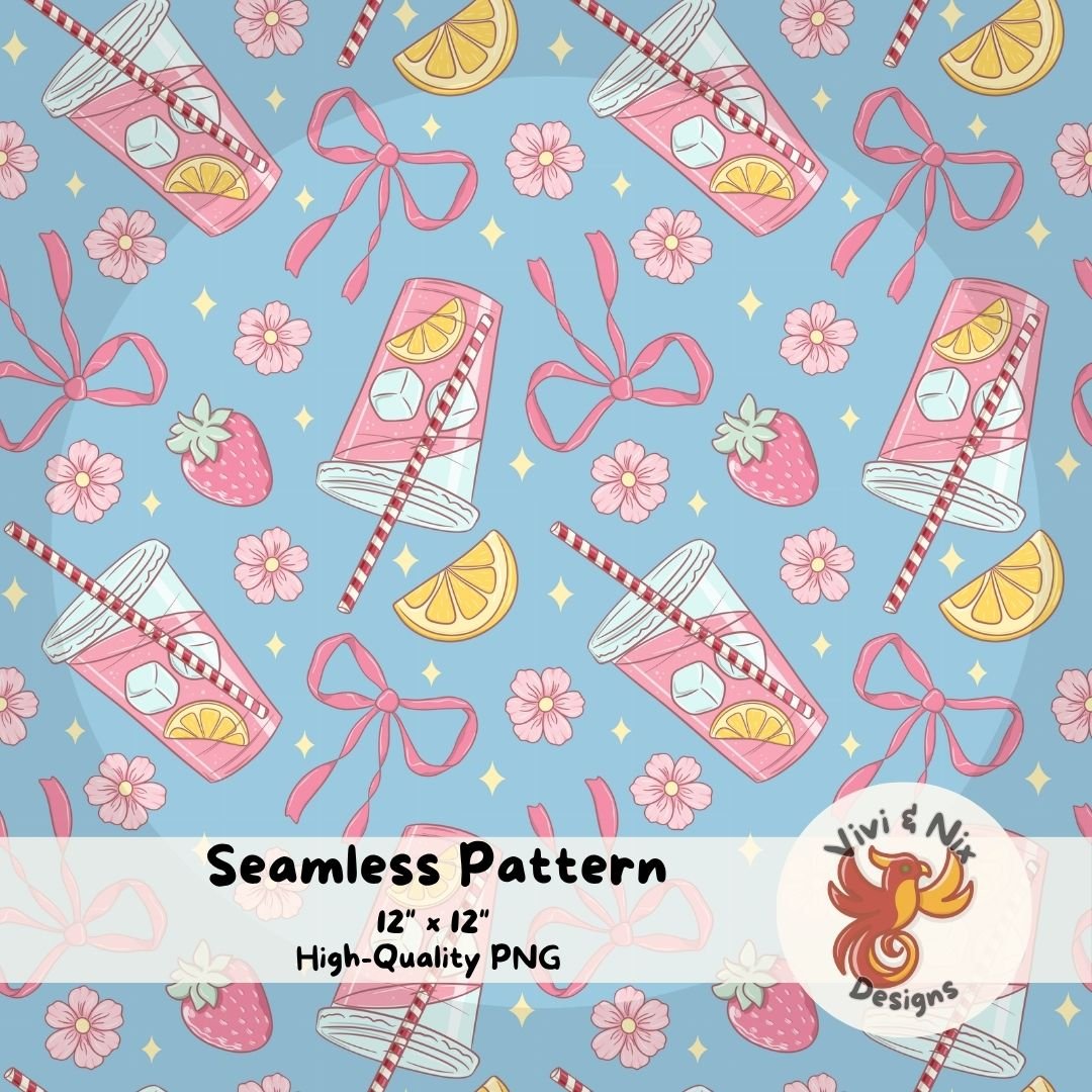Pink Lemonade Seamless Pattern Coquette Bow Summer Drink Pattern Strawberry Lemonade Digital Paper Cute Summer PNG