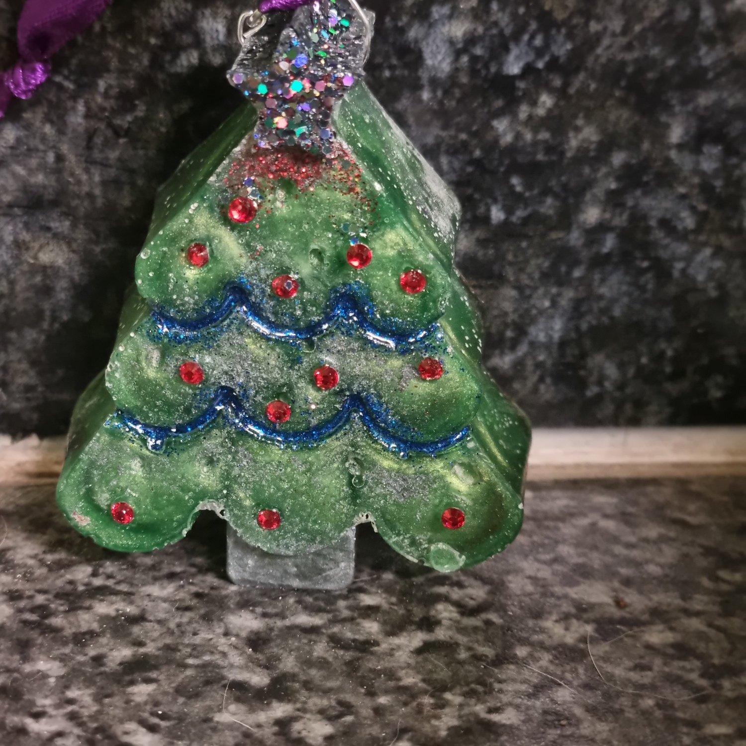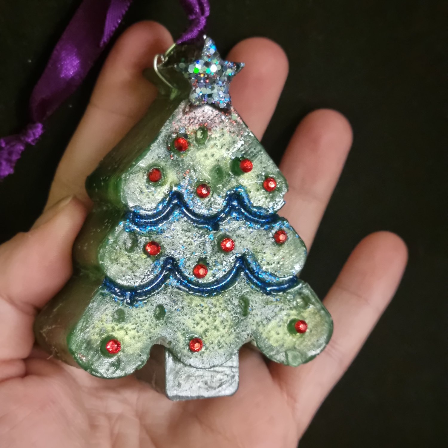 This enchanting little tree is made from resin infused with a blend of shimmering green mica powders, giving it a soft, mystical glow from every angle. Sparkling red rhinestones are delicately placed as baubles, adding that perfect pop of Christmas cheer. And of course, no tree is complete without its crown β a glittery star sitting proudly on top, ready to shine throughout the season.