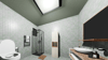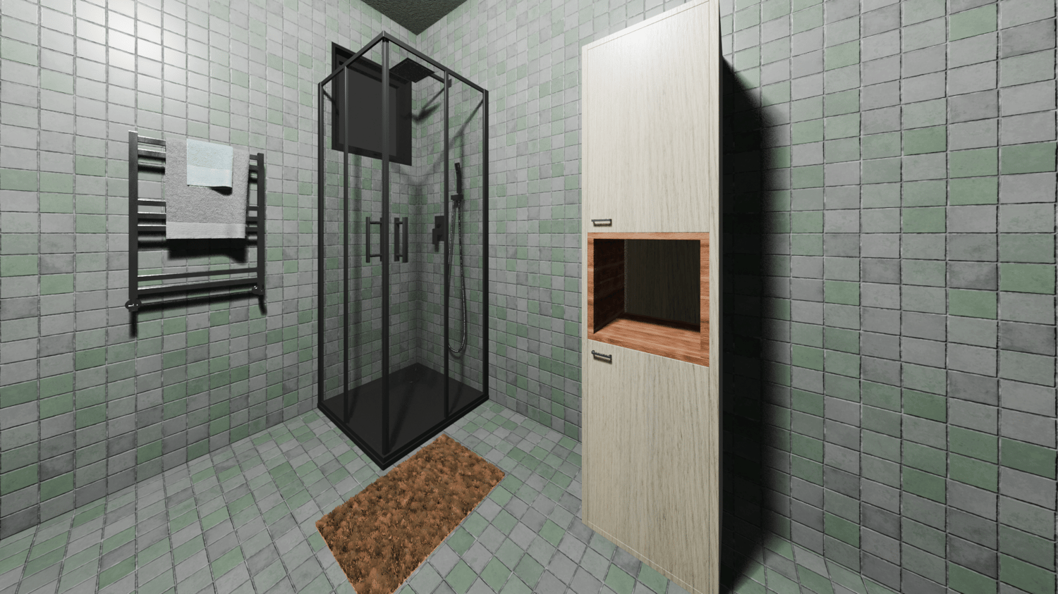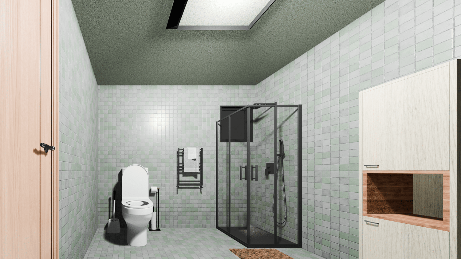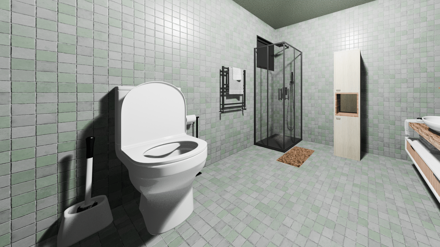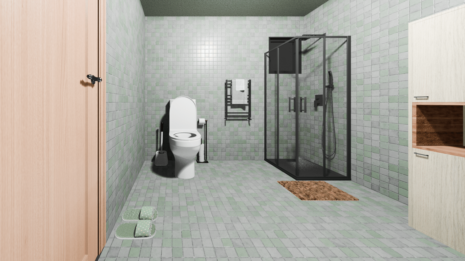 This model that is created with Blender 4.5 as an architectural render scene,Wall and Floor tiles also plaster color has been chosen green.