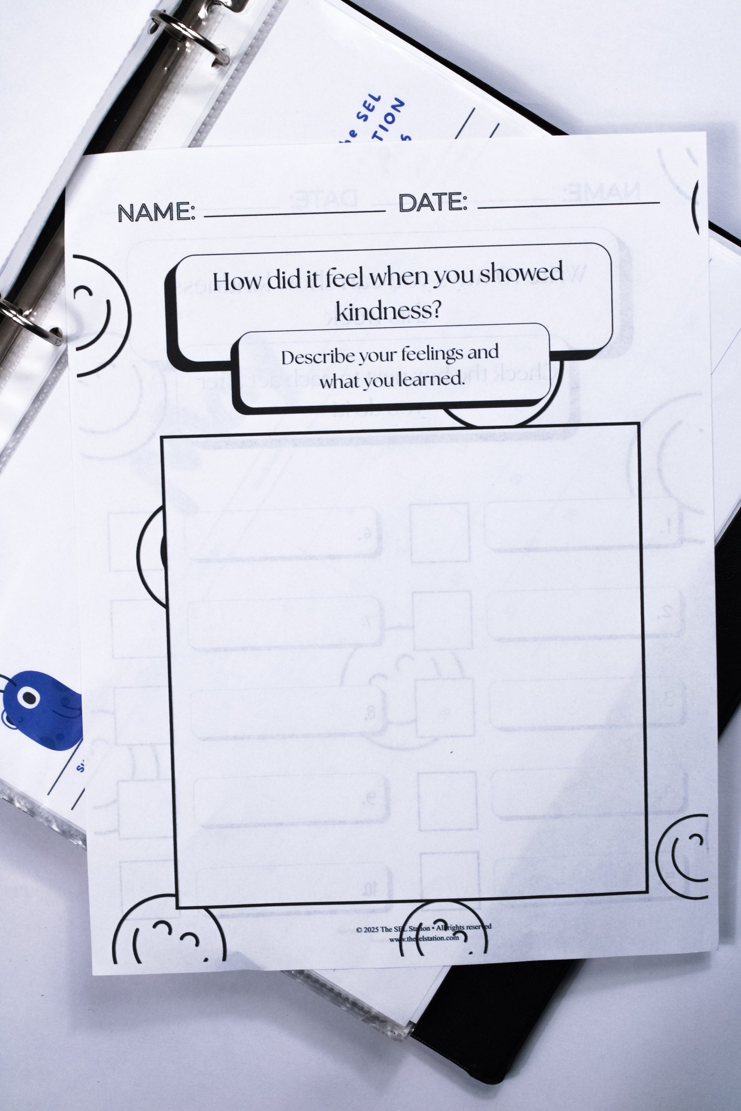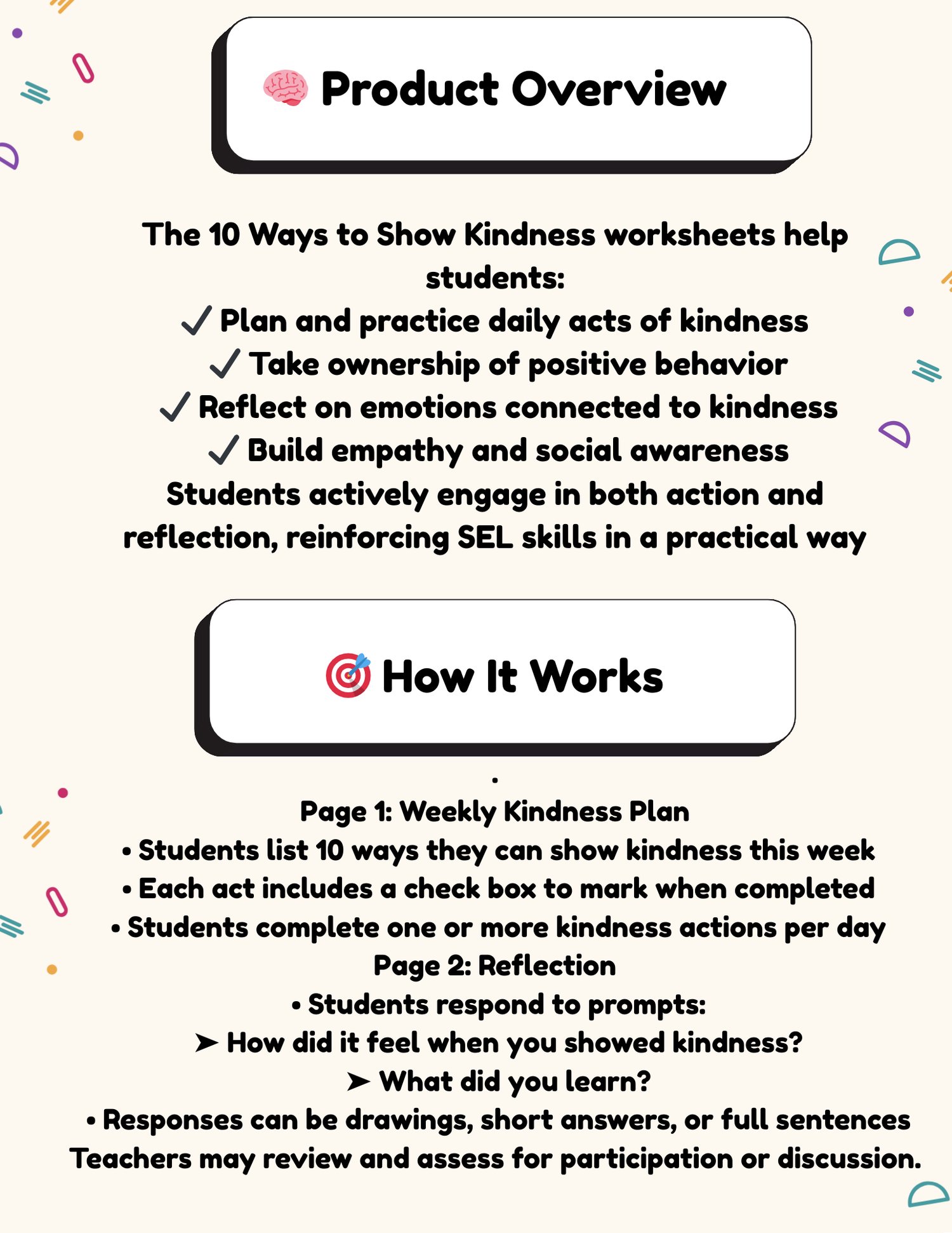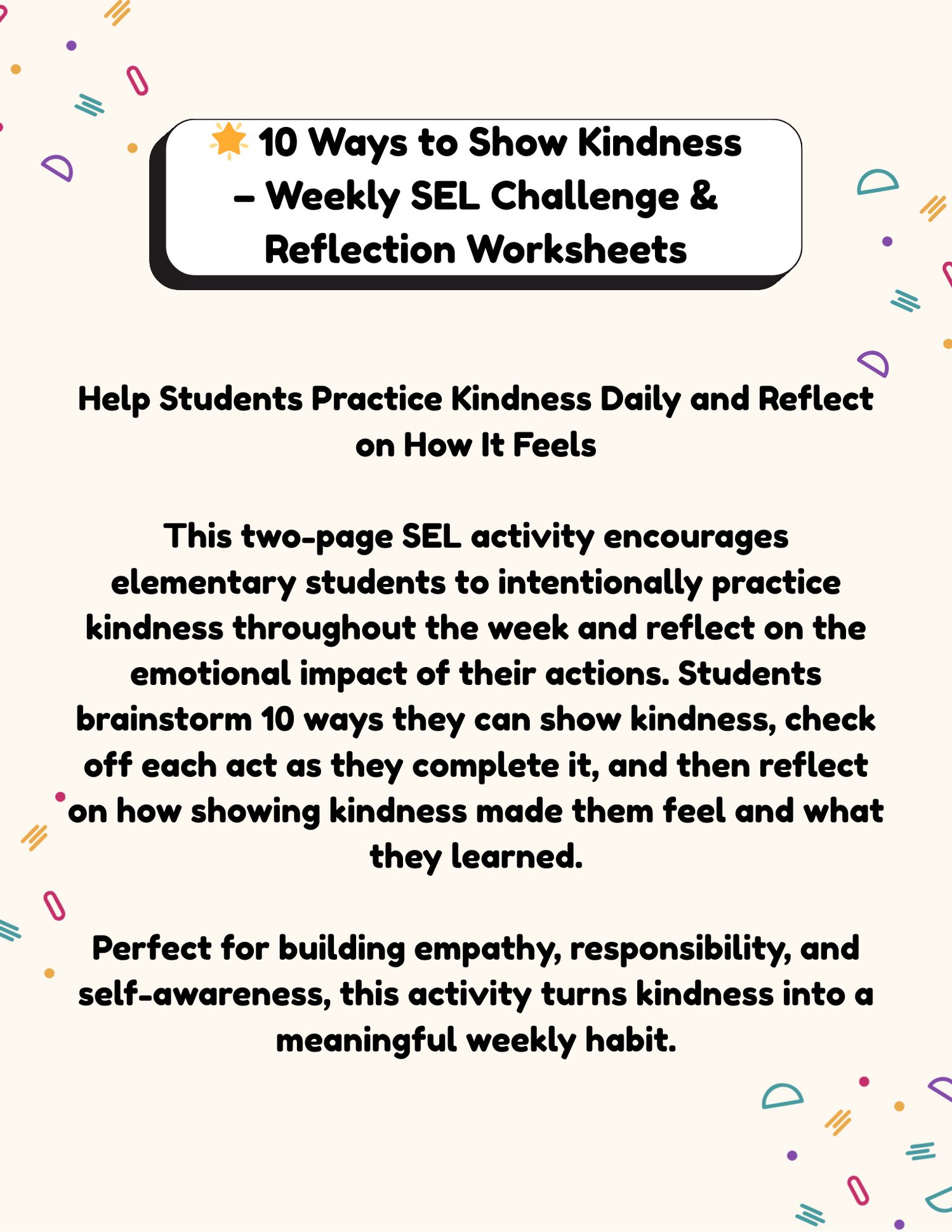 ✨Inspire ongoing kindness and reflection with this two-page printable — featuring ‘10 Ways I Can Show Kindness This Week’ checkboxes and a thoughtful Kindness Reflection page — perfect for weekly SEL lessons, morning meetings, classroom challenges, or at-home reflection for grades 1–5✨