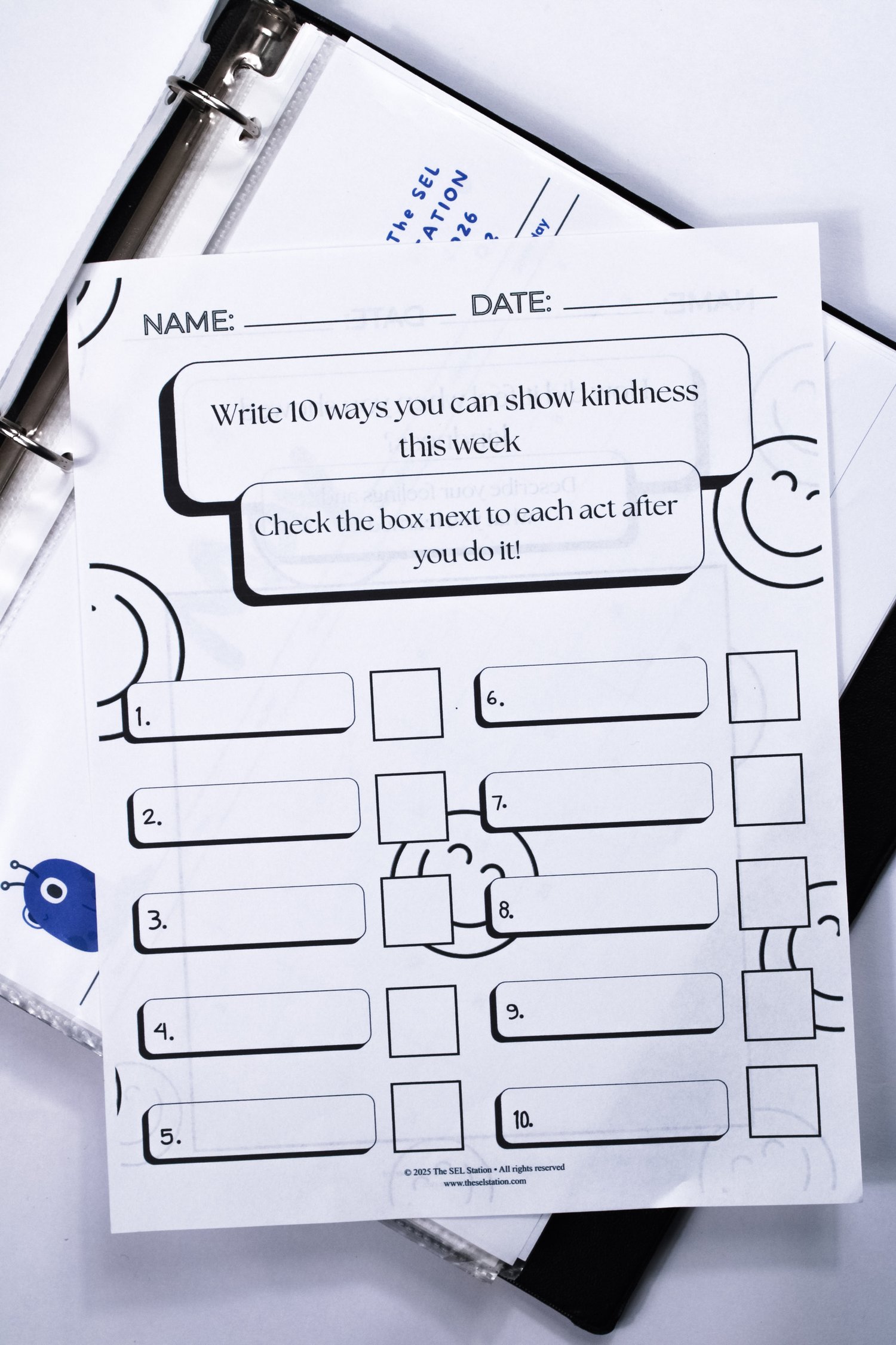 - 1 page: 10 Ways I Can Show Kindness This Week (with check boxes)