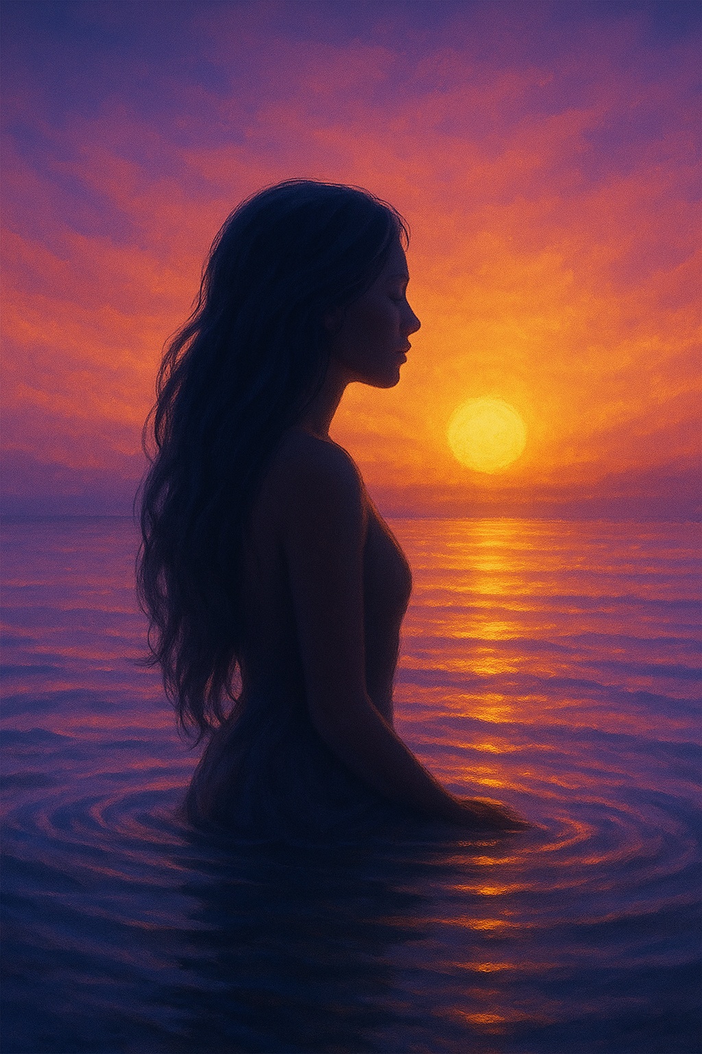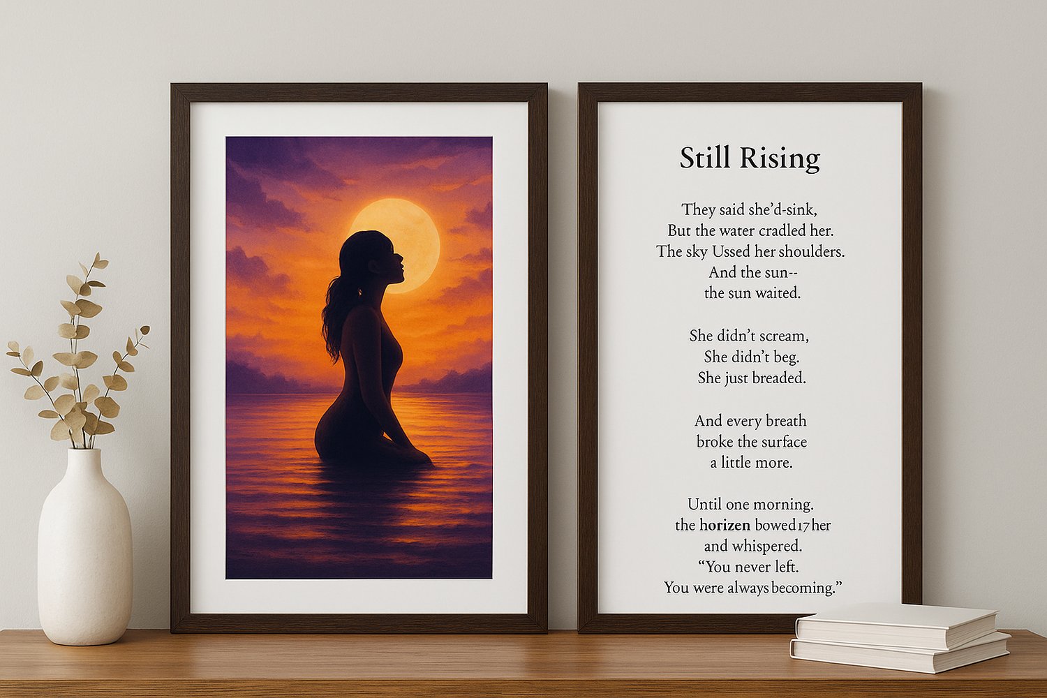 A powerful silhouette of a woman emerging from the water at sunrise. This print honors the sacred act of surviving, resting, and rising—on your own terms.