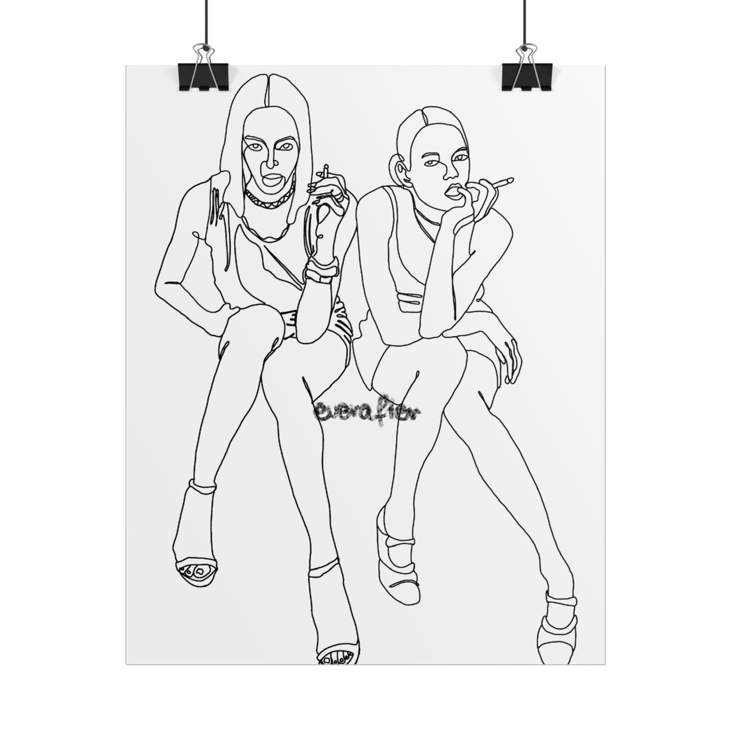 A bold line-art illustration of two confident women seated side-by-side, each holding a cigarette with nonchalant elegance. Their relaxed postures and expressive facial features convey a sense of modern attitude and self-assurance. The minimalist, monochromatic style emphasizes their fashion-forward outfits and high-heeled footwear, capturing a moment that feels both intimate and stylishly rebellious.