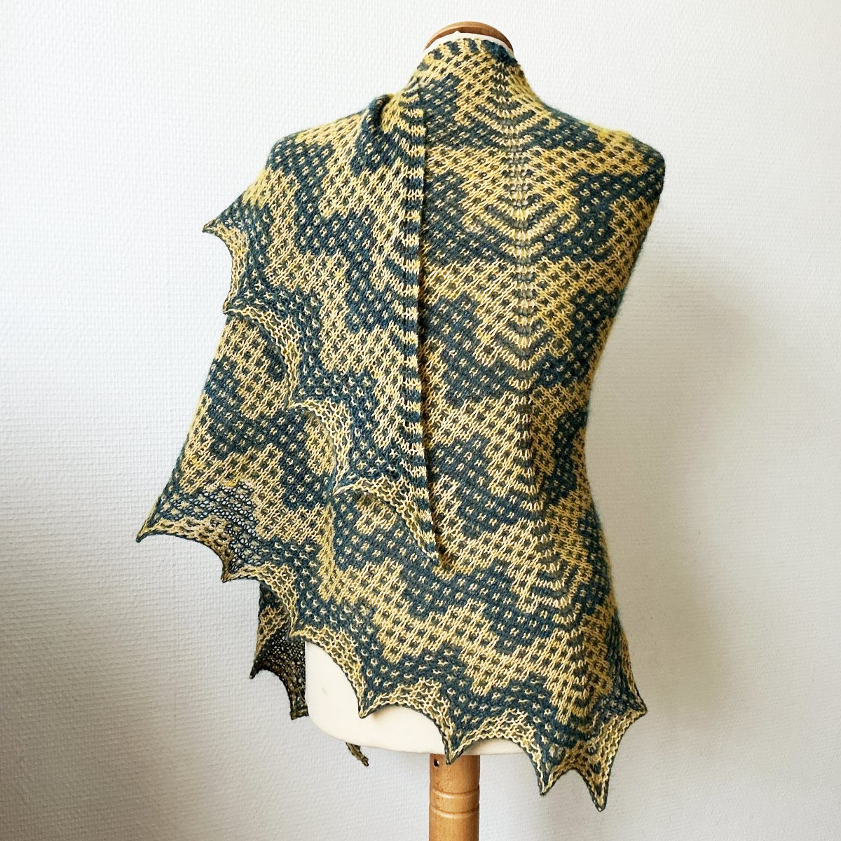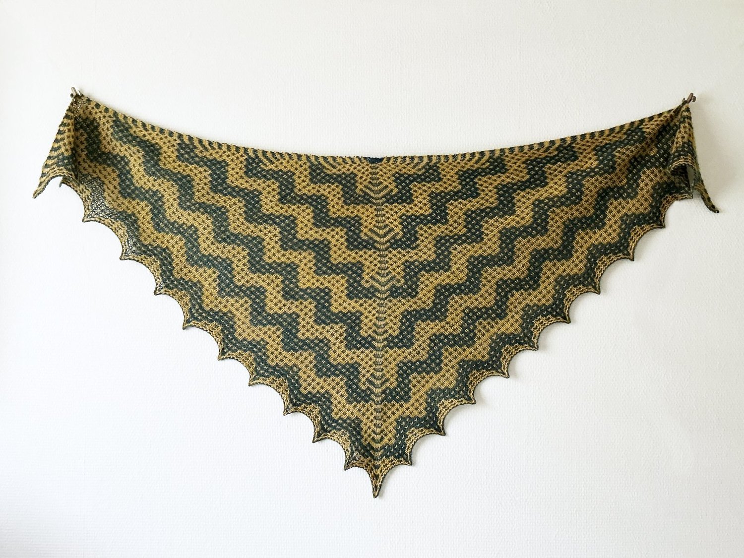 This triangle-shaped shawl is knit from the top down, starting with a garter tab cast-on. The color work uses the slip-stitch mosaic technique. Stitches used include knit, purl, right- and left-leaning increases, k2tog tbl, as well as slipping stitches.