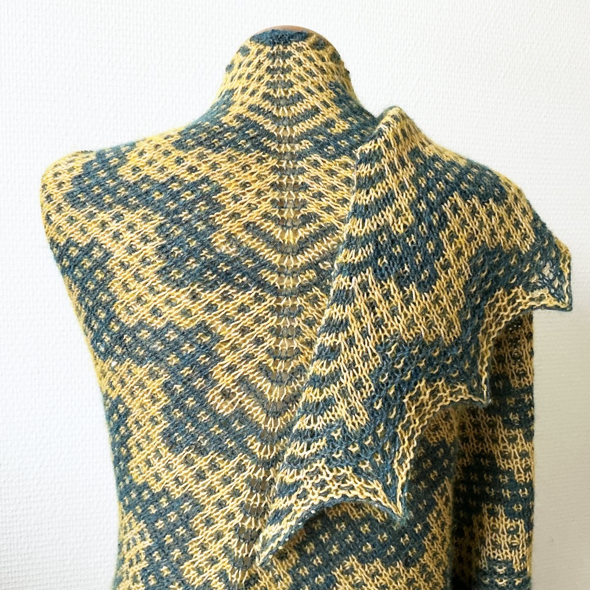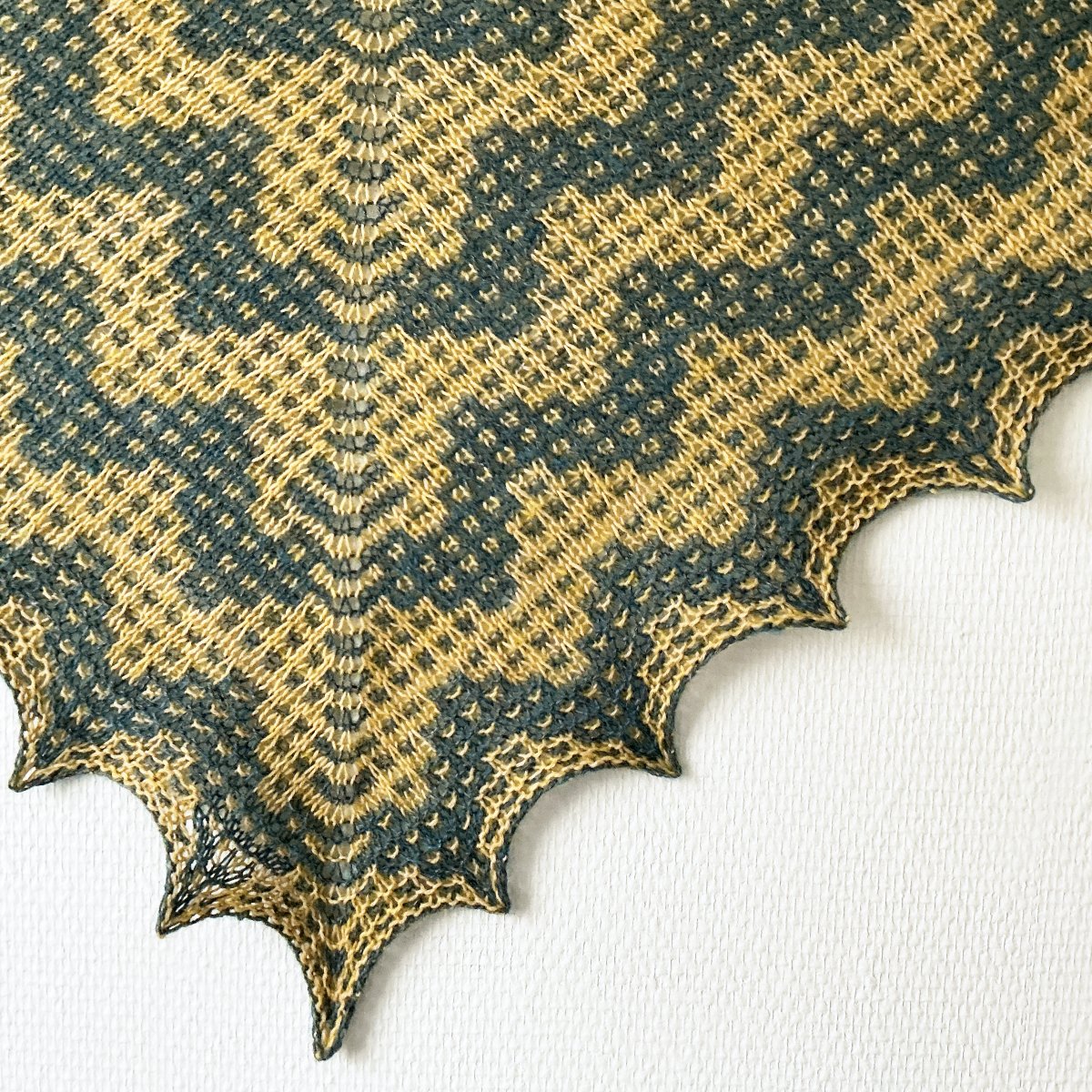 The shawl is started with a garter tab. The color work is done using the slip-stitch mosaic technique, so you will be handling only one strand of yarn at all times. The patterning is both charted and written out.
