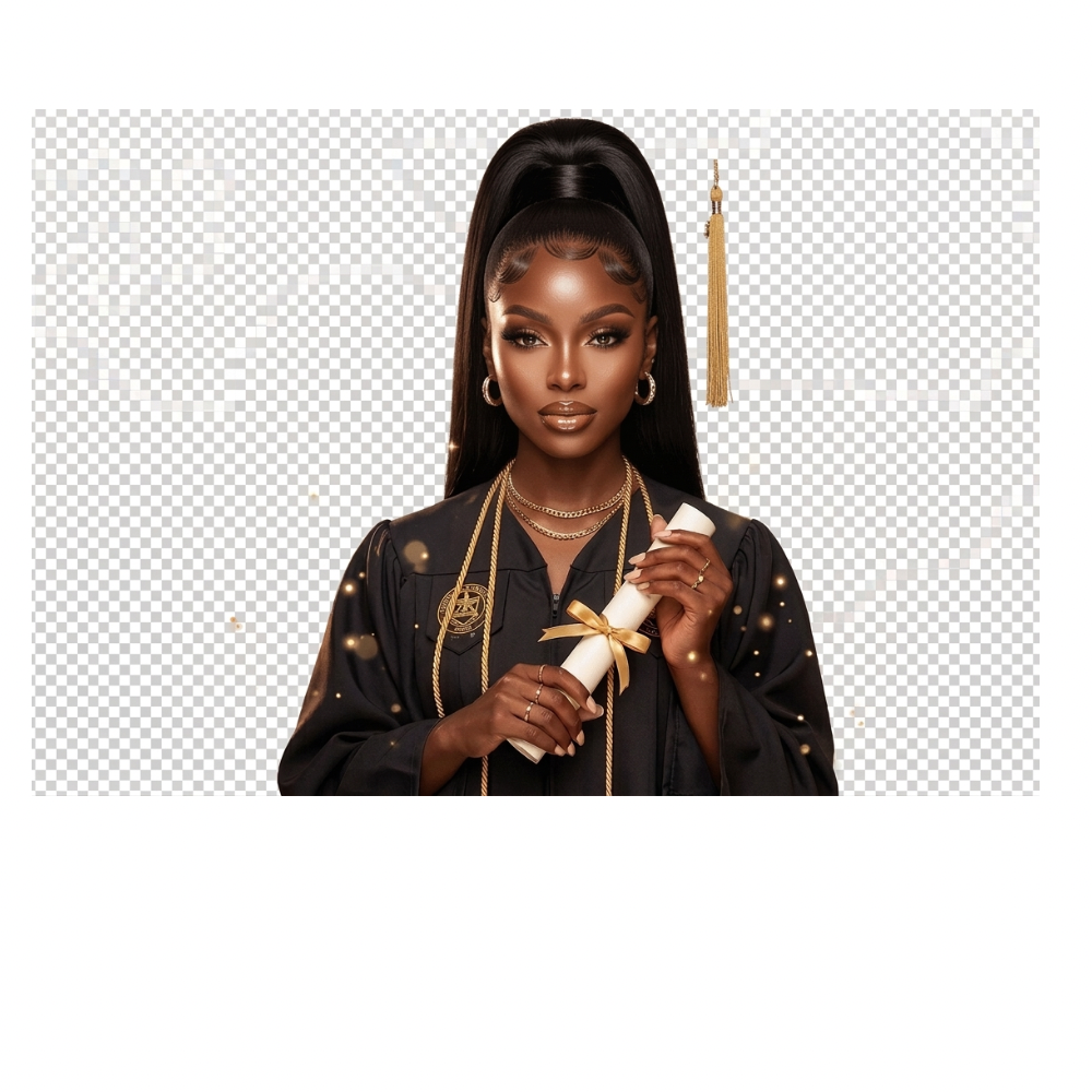 This bundle features confident, stylish African American graduation models in glamorous outfits, graduation caps and gowns, and editorial-style poses perfect for eye-catching designs.
