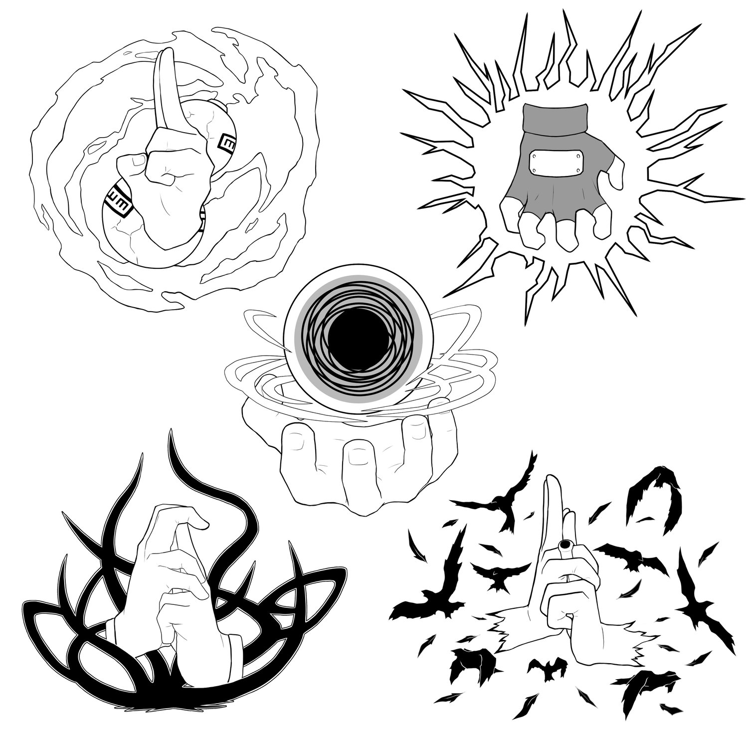 PNG, SVG, and PDF files of "Rasengan", "Chidori", "Sand", "Shadow Jutsu", and "Crow Summon" illustrations (white versions) in high quality 300dpi.