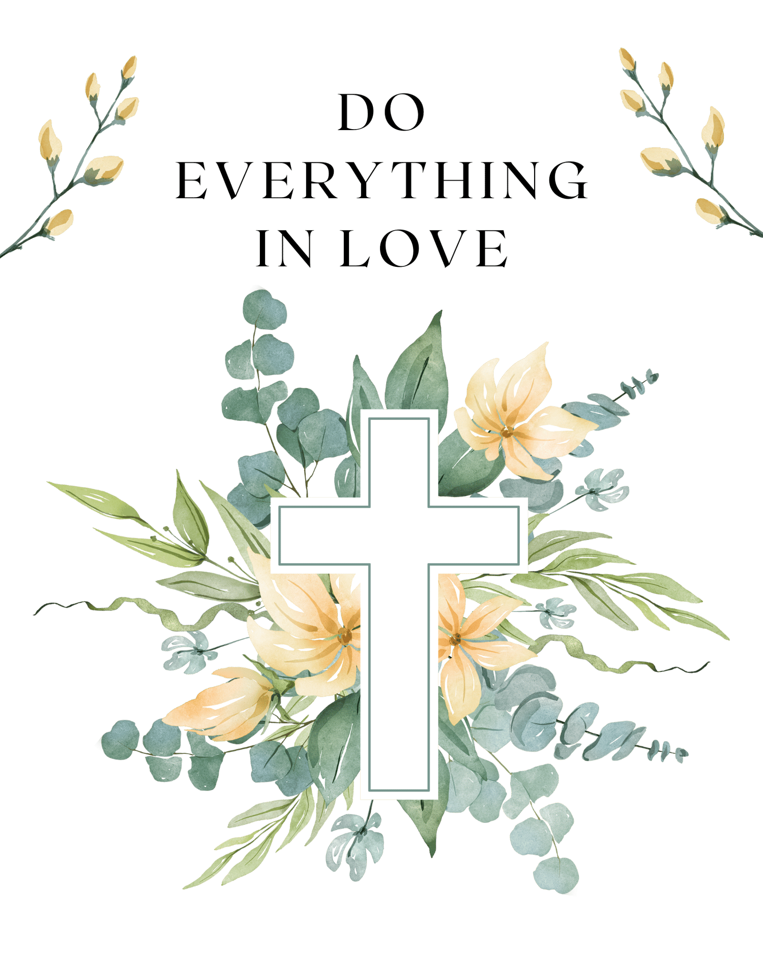 Do everything in love is a downloadable PNG file with a transparent background that will fit any 8 inch by 10 inch frame. Purchase a frame at any dollar store or flea market. Download it, print it, and frame it for less than $5.