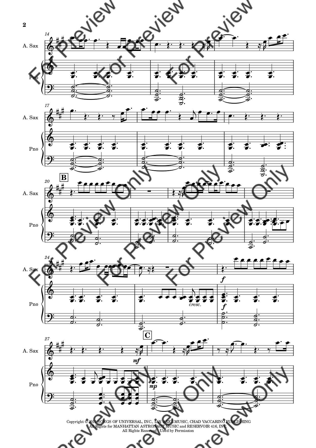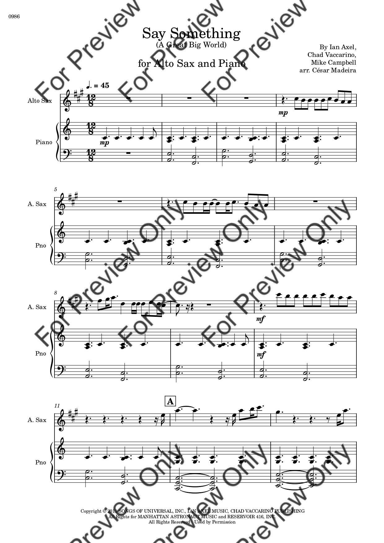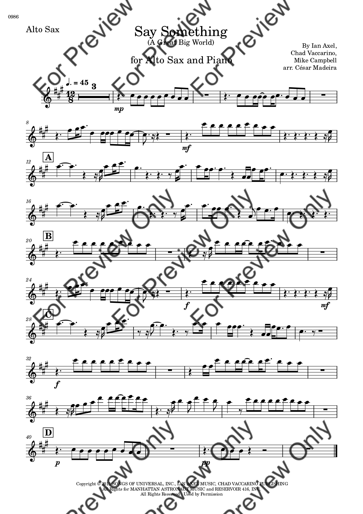 Say Something by A Great Big World and Christina Aguilera. Arrangement for Alto Saxophone and Piano. With Full Score and Individual Parts. Have fun!