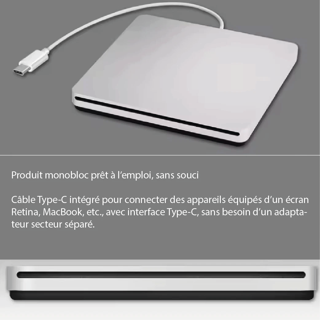 - 【Élégant et compact Lecteur de DVD】Ce lecteur CD DVD externe est doté d'un seul câble USB-C intégré à ce lecteur graveur CD DVD externe directement dans le port USB-C de votre Mac/MacBook Air Pro/ordinateur portable. Vous n'aurez jamais à vous soucier des câbles perdus avec ce lecteur DVD externe à tout moment.