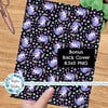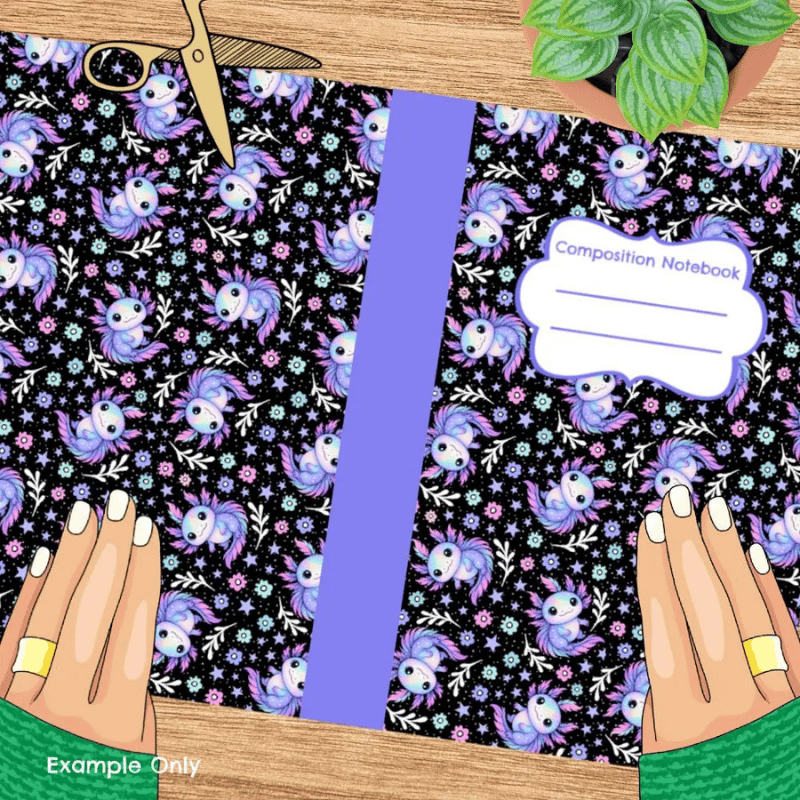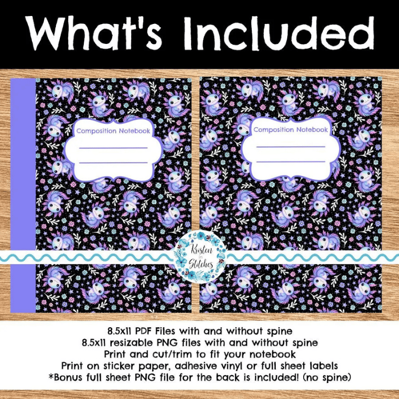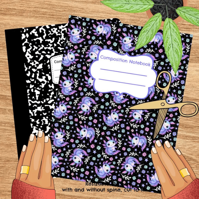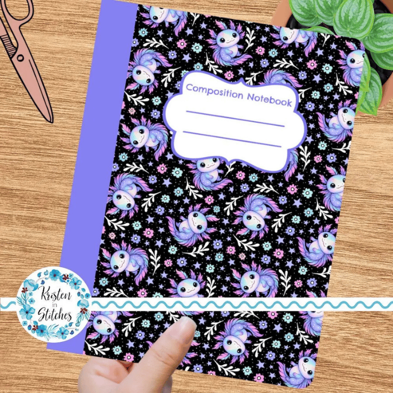 Composition Notebook Cover, Printable Resizable PNG, PDF, Pastel Baby Axolotls on Black