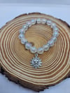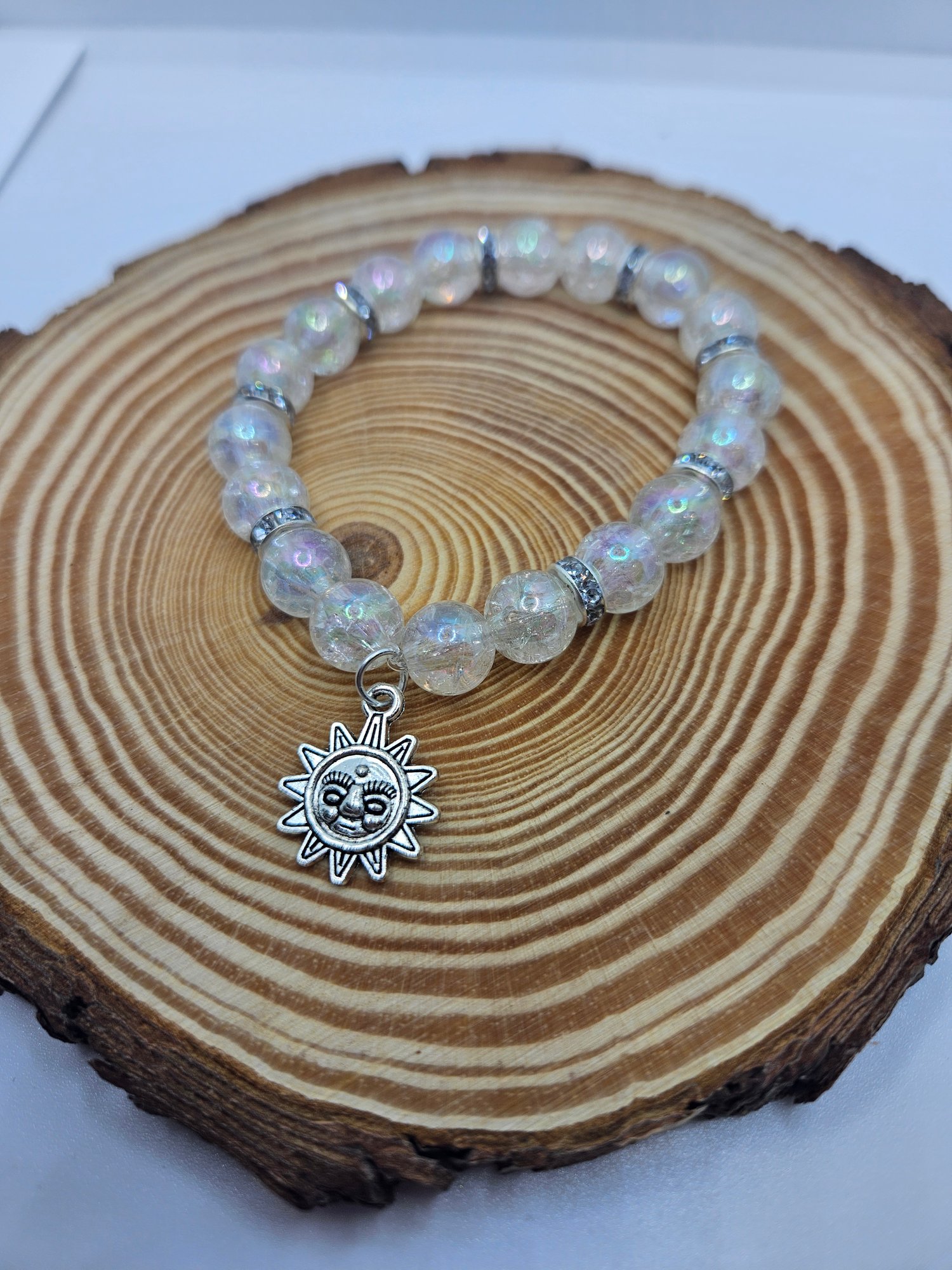 This handmade bracelet features delicate, white glass pearls paired with sparkling spacer beads, adding a touch of elegance and shimmer. At the center is a radiant sun charm, symbolizing positivity, warmth, and new beginnings. The combination of the pearls and sun motif makes this bracelet a perfect accessory for any occasion, radiating both grace and meaning. Ideal for those who love celestial themes and timeless designs.
