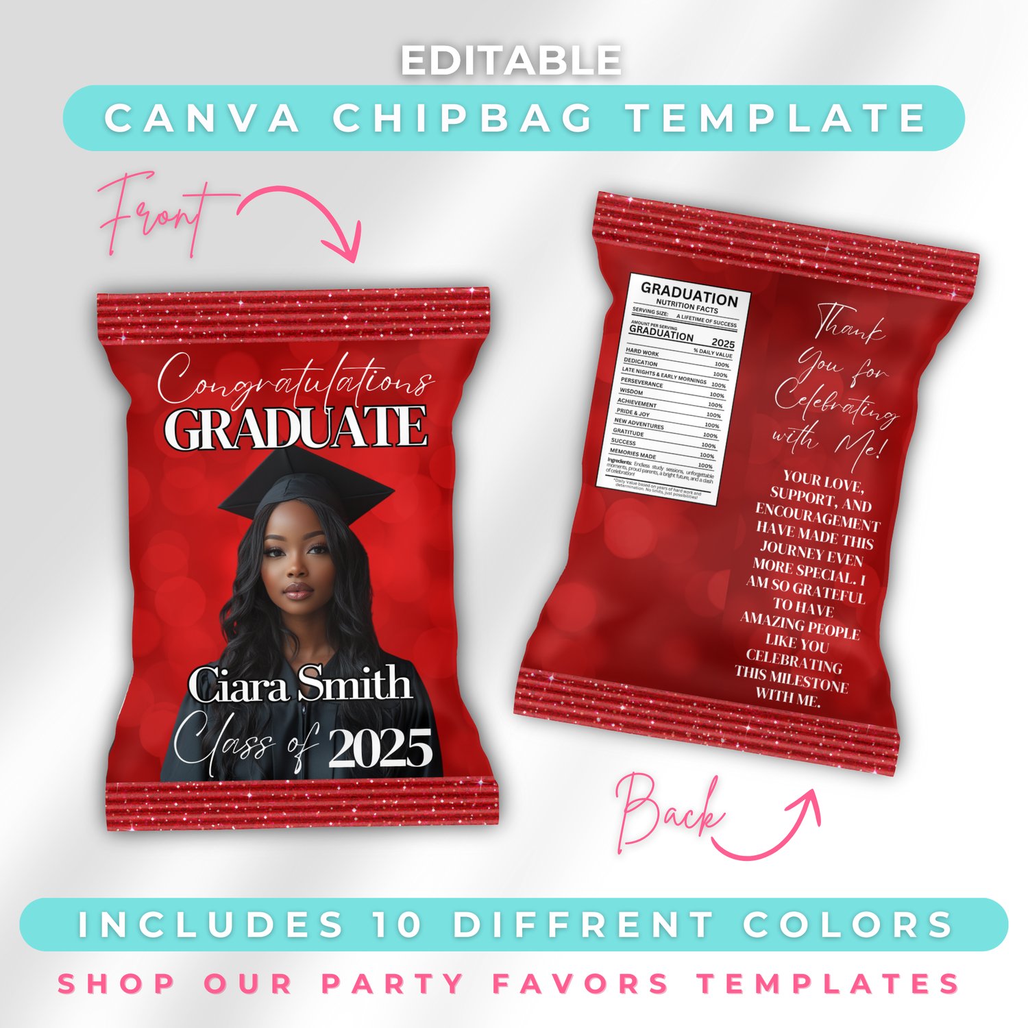 Celebrate your graduate in style with this Editable Graduation Chip Bag Bundle! Featuring 10 stunning color variations, this fully customizable Canva template makes it easy to create unique party favors for any graduation celebration.