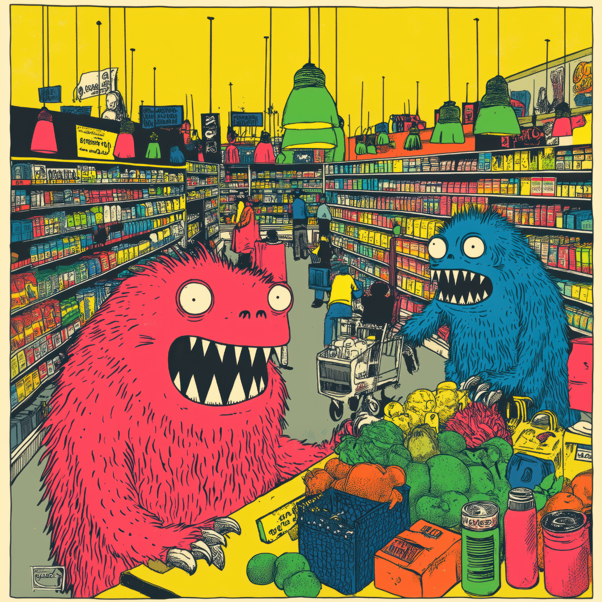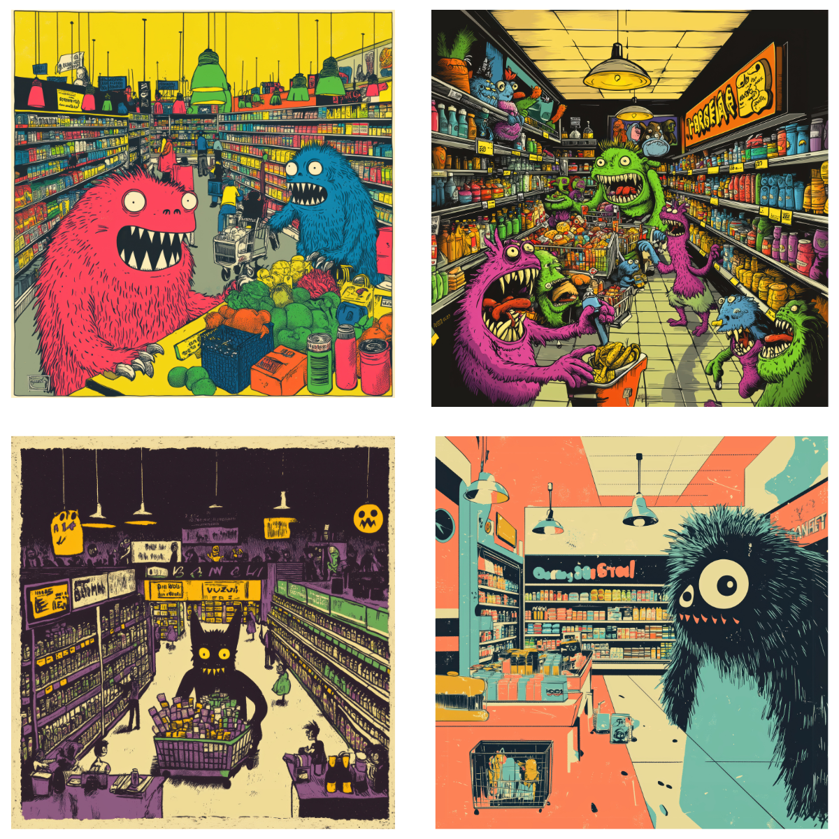 Ghouls. Now you can drop a monster in the mail! This set of four 24/7 Demon Mart mailable postcards are 4.72 inch x 4.72 inches. They're printed on 18 point cardstock with a smooth velvet finish on the front, so they are perfect to mail or to display as an art card.