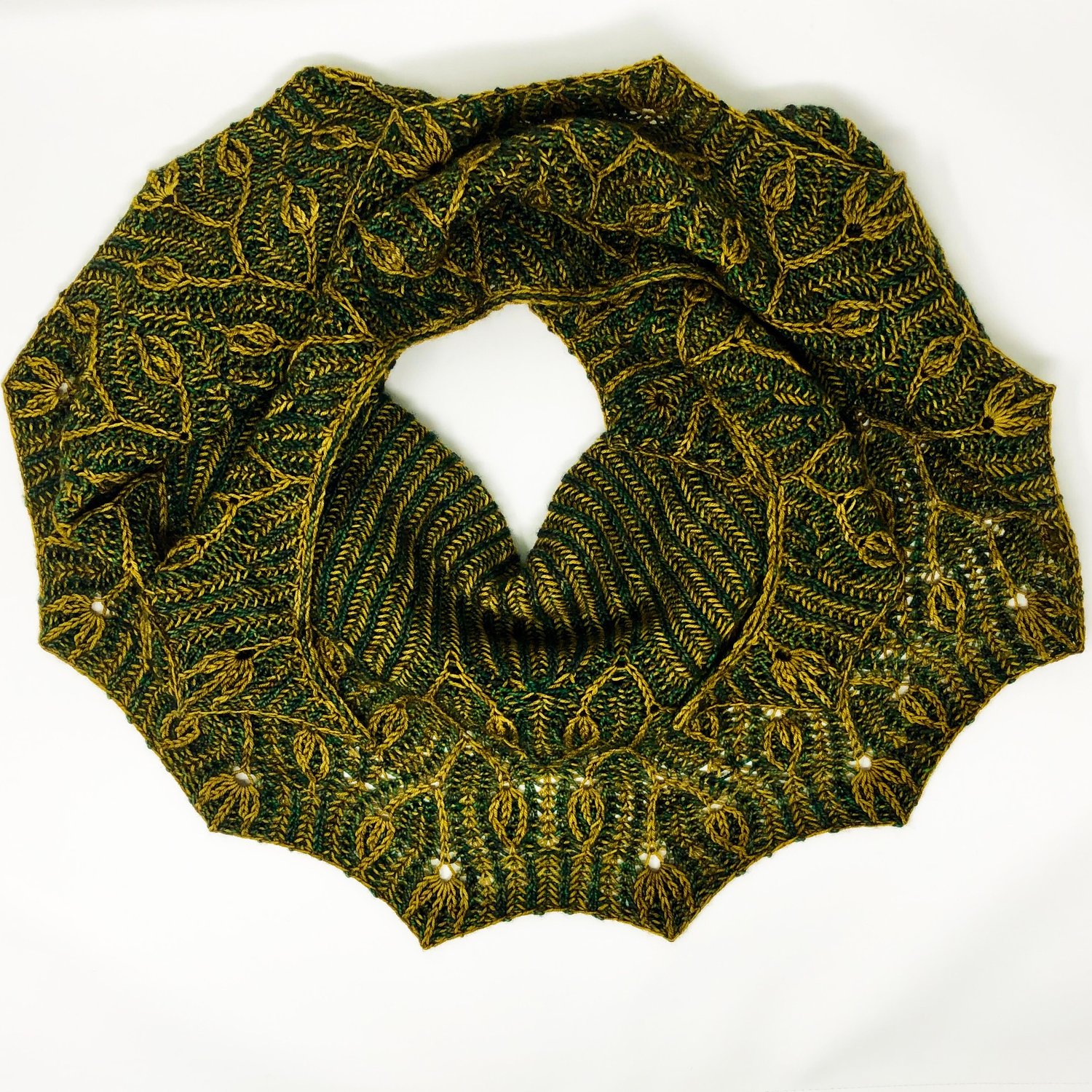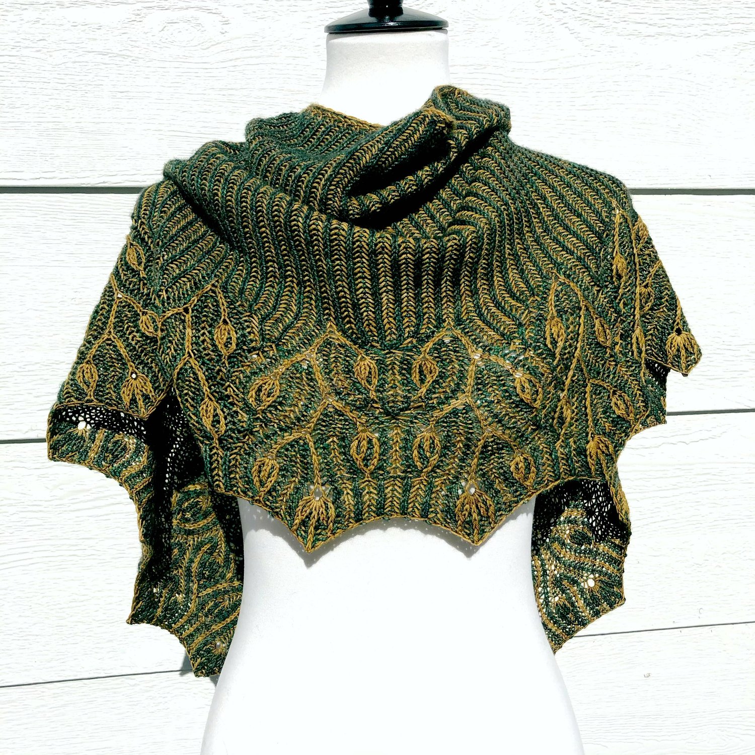 This beautiful crescent shaped shawl is knit top down and from the center out. The shawl is knit using the two-color brioche stitch and features an original design of branching leaves created using brioche increases, decreases and syncopation.