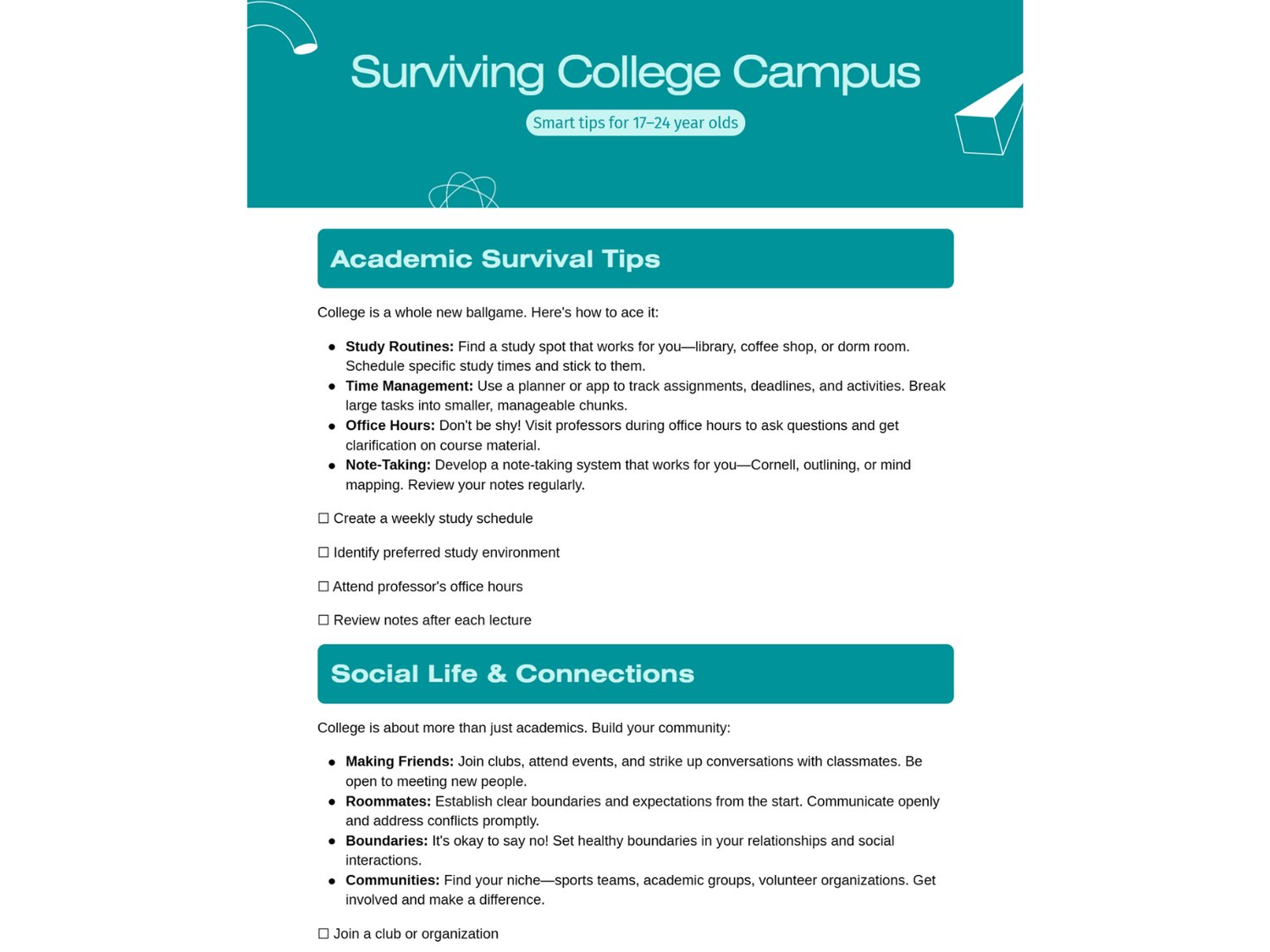 This PDF gives students ages 17–24 everything they need to stay safe, study smarter, manage time, build social confidence, and avoid common campus mistakes.