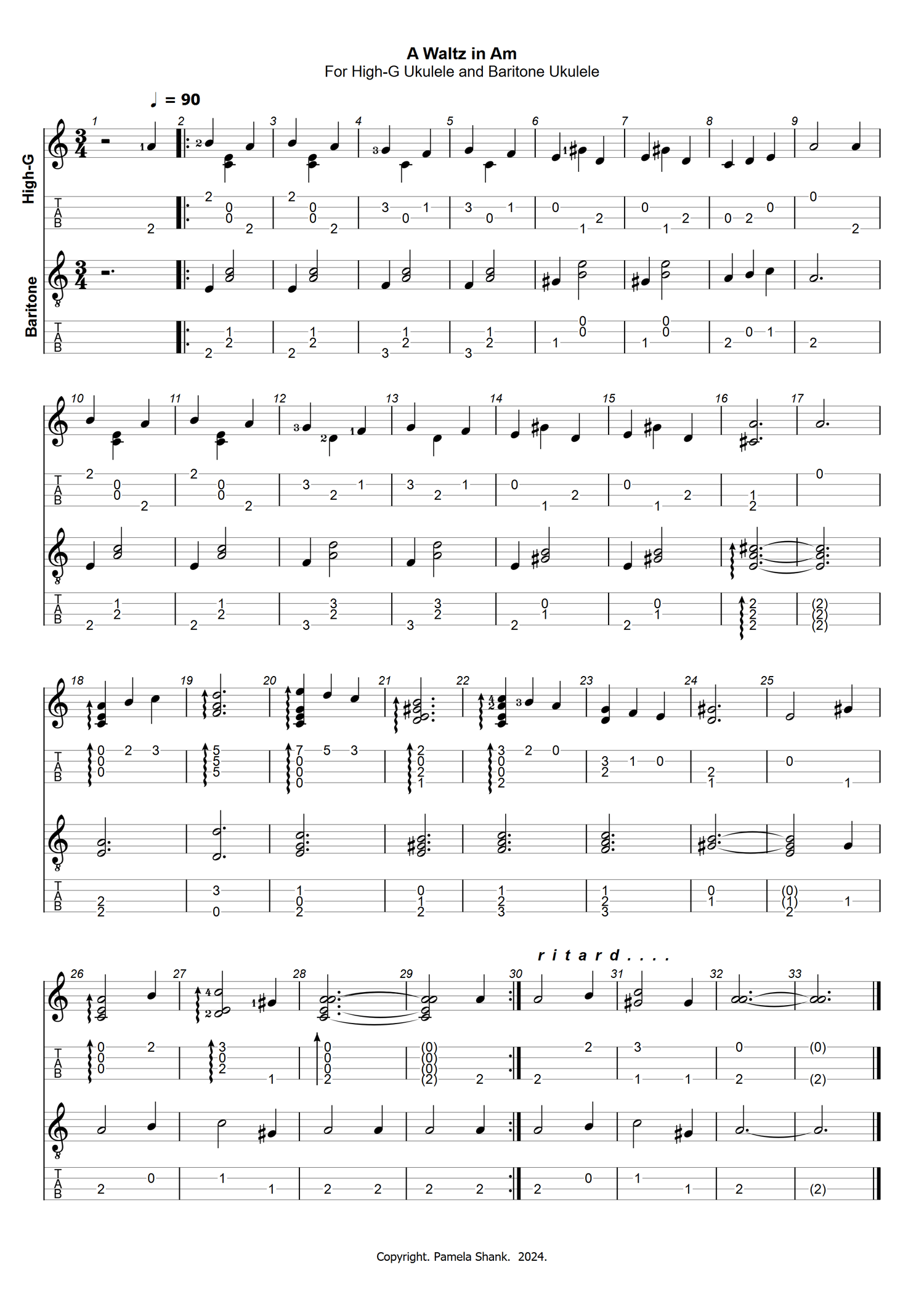 Eight original waltzes, in eight different keys (six written for High-G ukulele, and two written for Low-G ukulele). Also included is an (optional) accompaniment score for Baritone ukulele. These pieces are playable and enjoyable for all levels -- beginners, advanced beginners, intermediate, and beyond. The pieces provide opportunities to play melodies written in a style of campanella and with a technique of legato, allowing for lovely overtones and flowing, connected notes. Arpeggios and slides and harmonics add to the simple elegance of the pieces. The waltzes are in the keys of A minor; Bb Major; C Major; D Major; D minor; E minor; F Major, and G Major. You can hear the pieces on my YouTube site at: https://youtube.com/playlist?list=PLxvyuPU1CAbhXhdr7X4Us2DSgeB5YBau7&si=T2nshNM7yW3xxJky