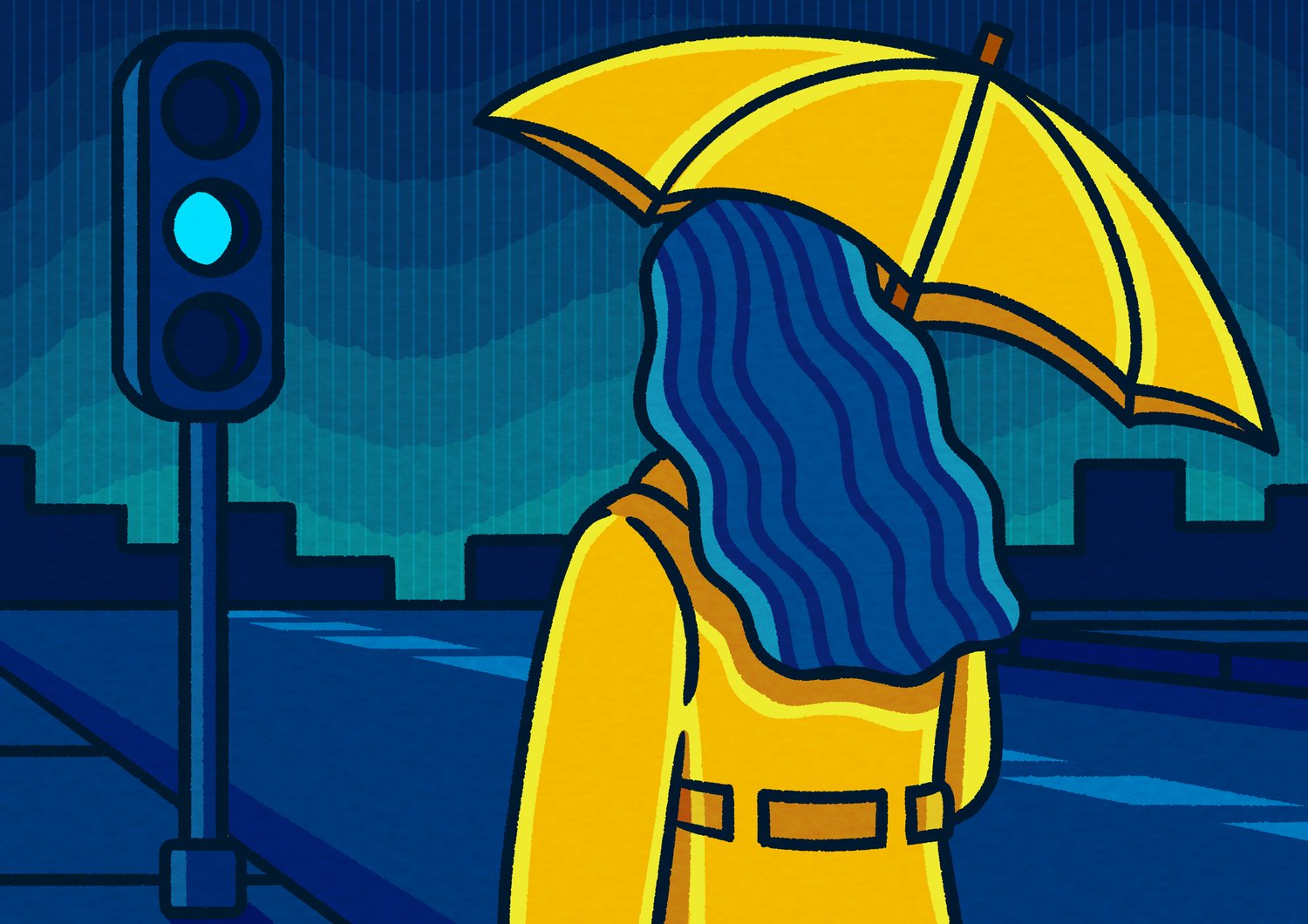 Waiting For A Ride captures a quiet, in-between moment of a woman standing alone on an empty street, waiting for a ride that has yet to arrive. The scene suggests the rain has just ended, shown through her raincoat and umbrella, while the cool blue tones of the surroundings emphasize the stillness after the storm. The traffic light glowing softly beside her adds to the sense of pause and anticipation, highlighting the solitude of waiting in a city that feels momentarily asleep. The artwork focuses on this simple, relatable moment, turning an ordinary wait into something calm, reflective, and slightly melancholic.