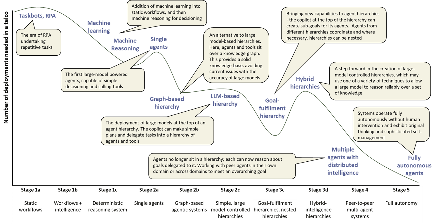This research discusses a technical maturity model, created to allow telcos and vendors to understand the future stages that agents, models, data and knowledge will have to take in order to reach autonomy in processes across the telco.