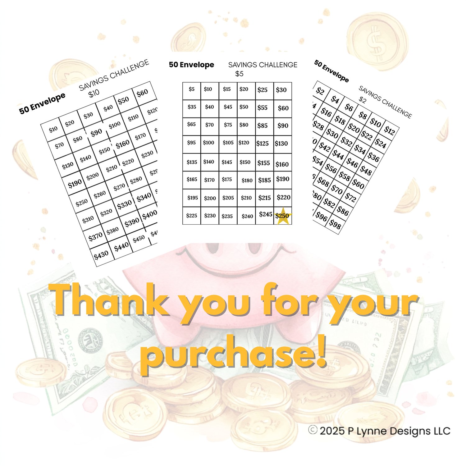 ✔️ Three sheets (one for $2, $5, and $10) so you can track by putting a checkmark or small stickers, so you can see where you are in your savings.