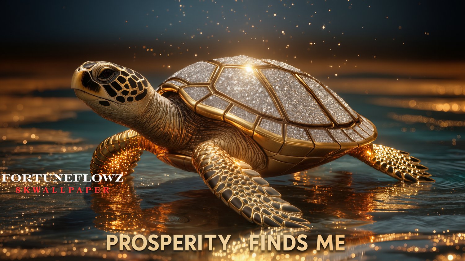 This 8K PC wallpaper showcases a highly detailed golden turtle rendered in a realistic 3D style, featuring reflective metallic surfaces and gemstone-like textures. The calm aquatic setting and warm lighting create a visually balanced scene suited for modern desktop environments.