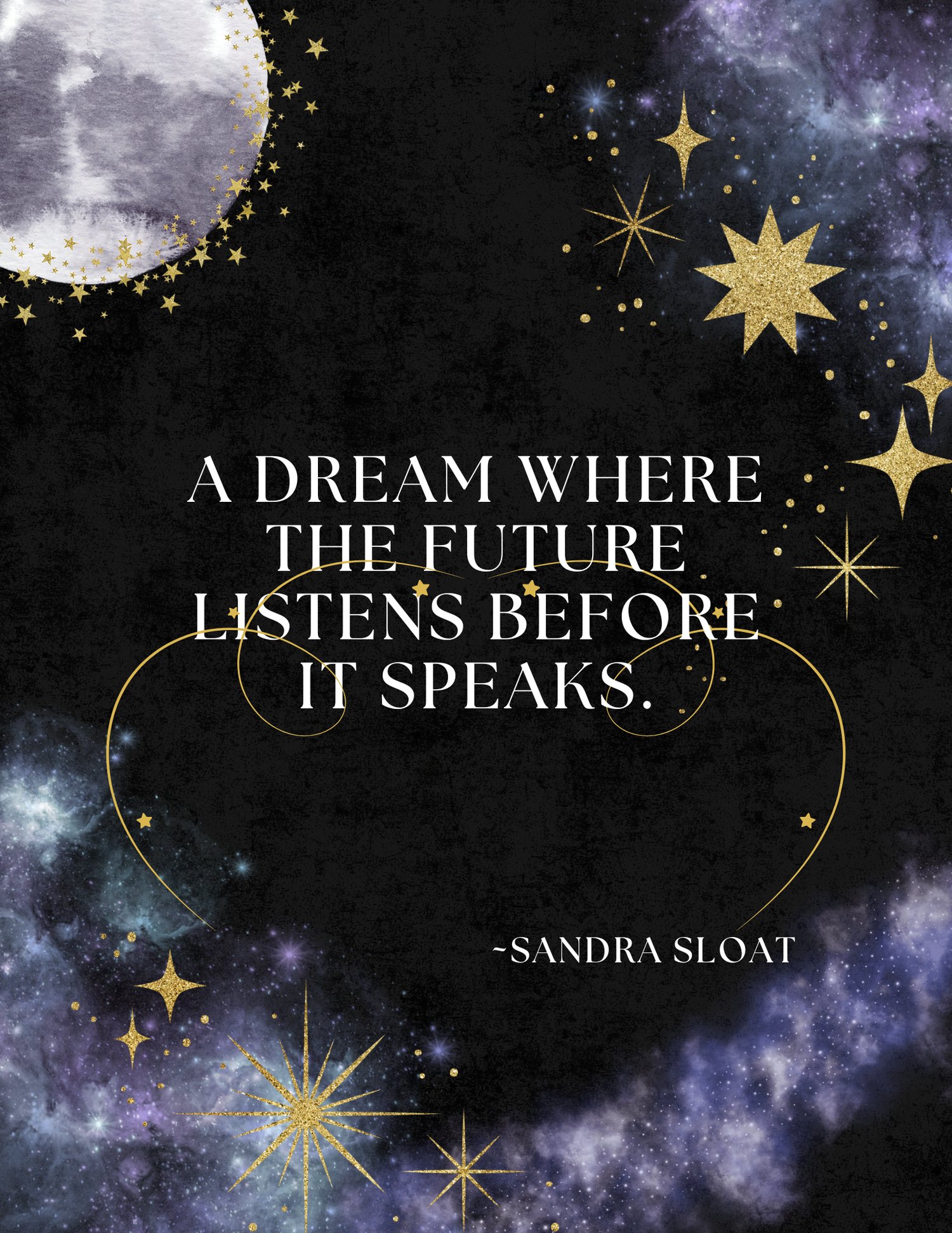 This 11×14 matte poster features an original quote by Sandra Sloat, set against a celestial night-sky design with gold star accents. A larger statement piece designed to inspire reflection, listening, and hope for the future.