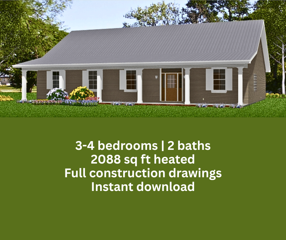 The Jasmine Home Plan – 3-4 Bed / 2 Bath Ranch Style House | 2088 sq ft Living | Instant PDF Blueprint Download