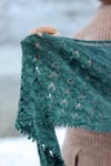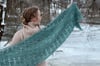 Liquid is a cresent shaped shawl with alternating garter stitch and lace sections. The lace is easy to memorize and the shapes the shawl with short rows.