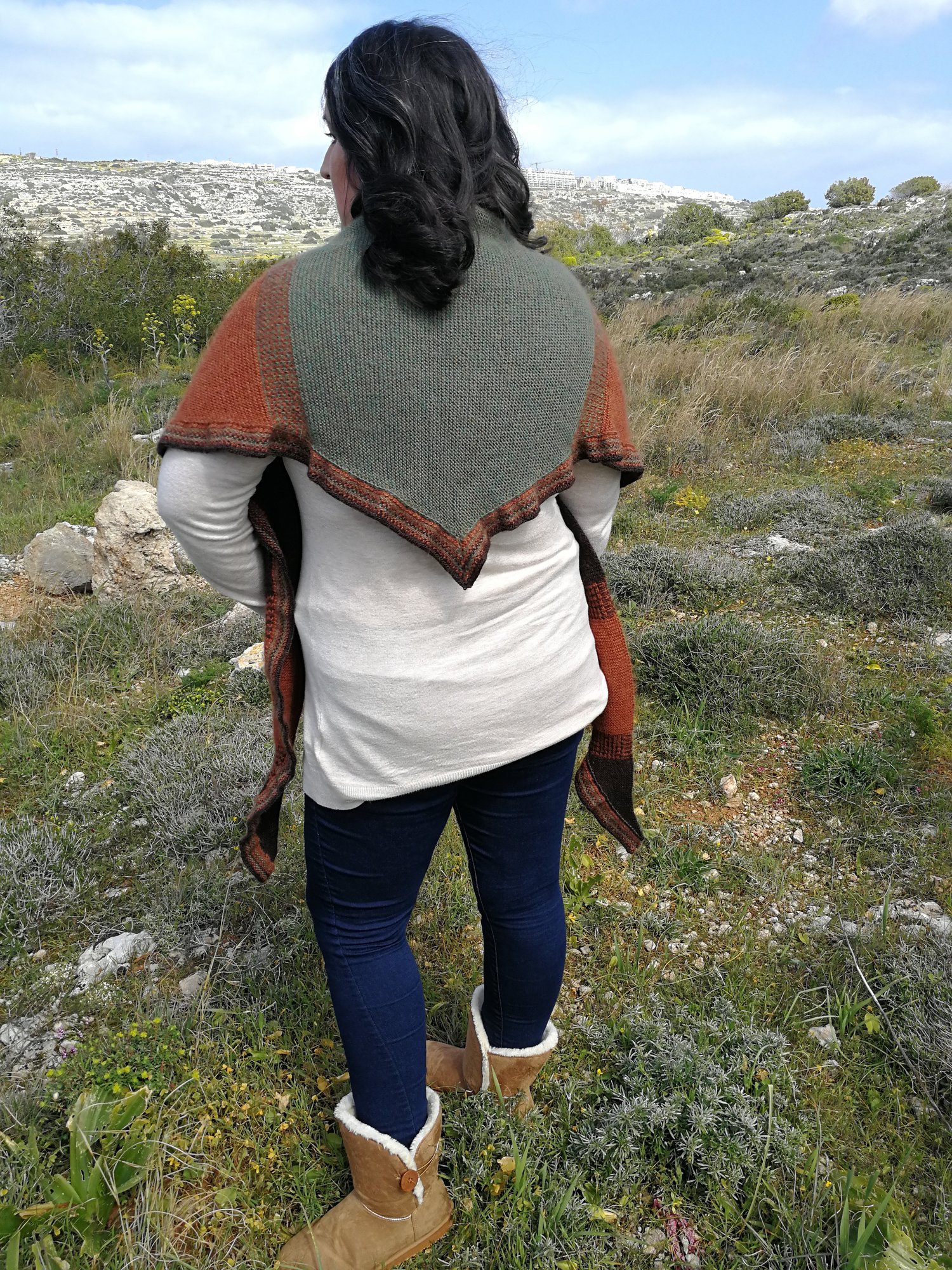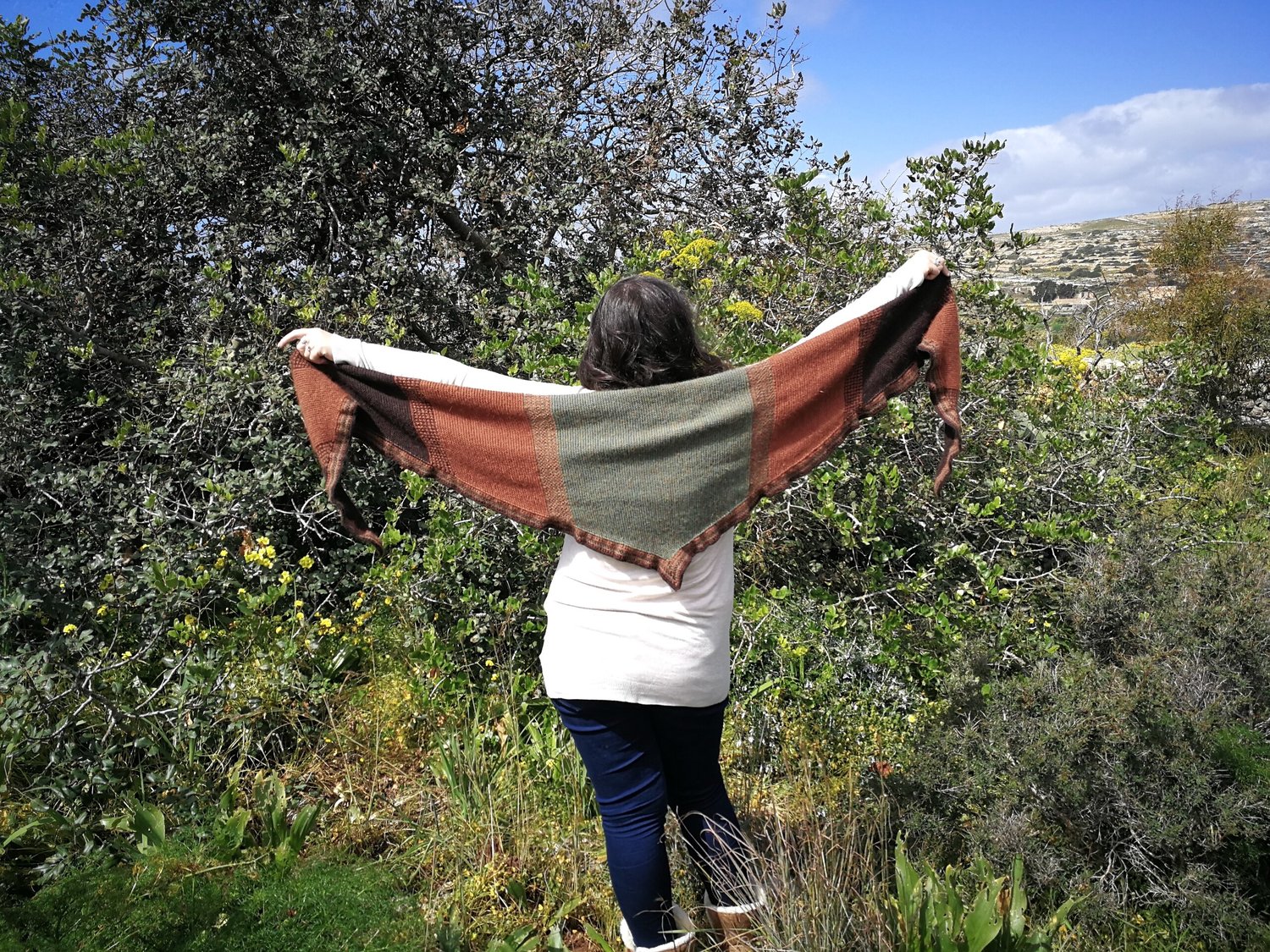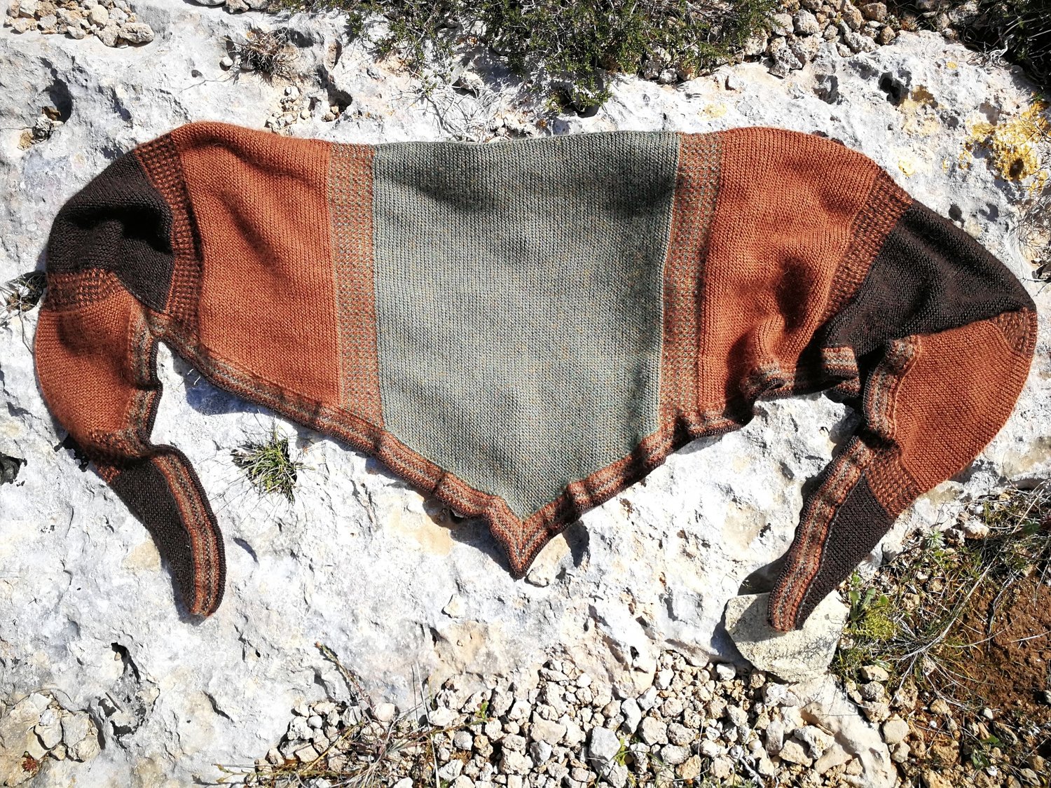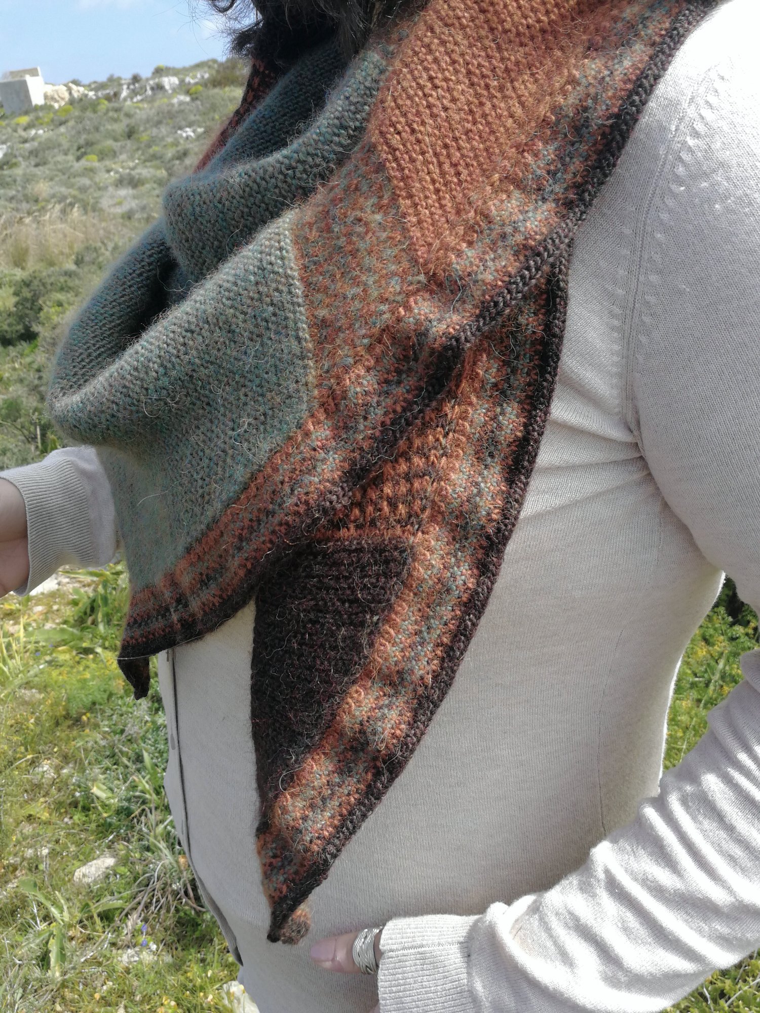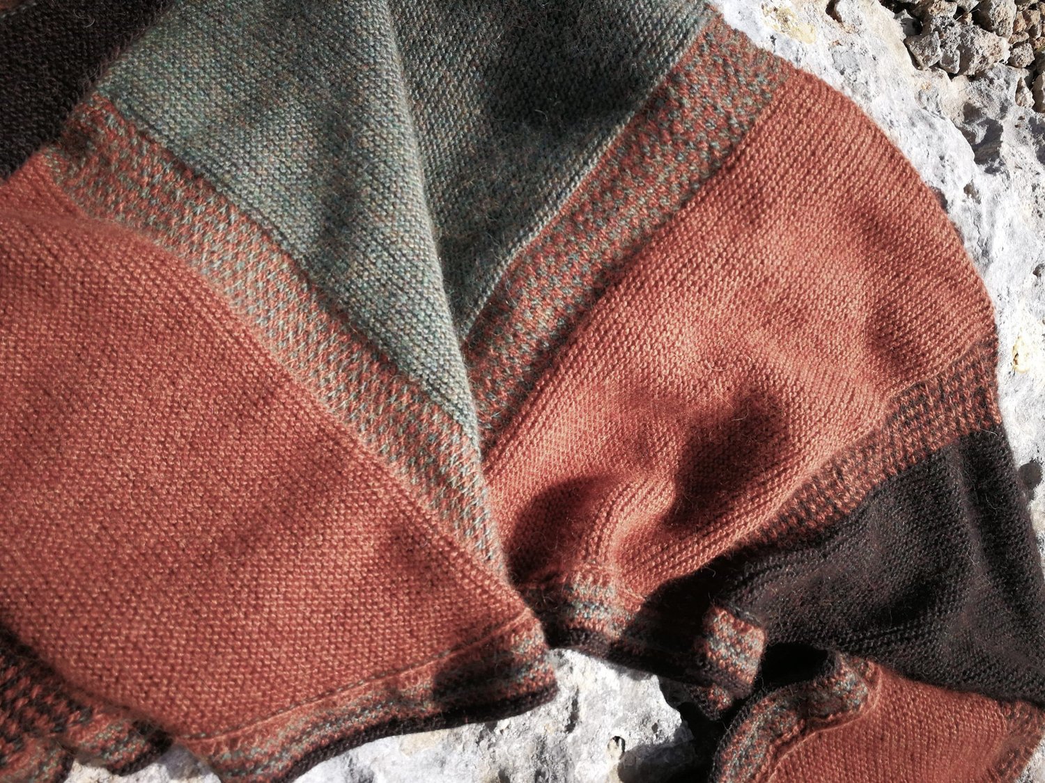 It is worked in 3 colours, which move smoothly into each other by way of connecting slipped stitch panels, with stitches picked up all along the shaped edge of the shawl to finish with an applied linen stitch border which brings all the colours together. It’s a very rustic natural un-fussed with style of shawl with a natural waviness due to very minimal blocking, and which also happens due to the construction of the applied linen stitch border being added by picking up stitches along the edges of the garter and slipped stitch panels. It therefore relies on the construction rather than blocking to form all shapes.