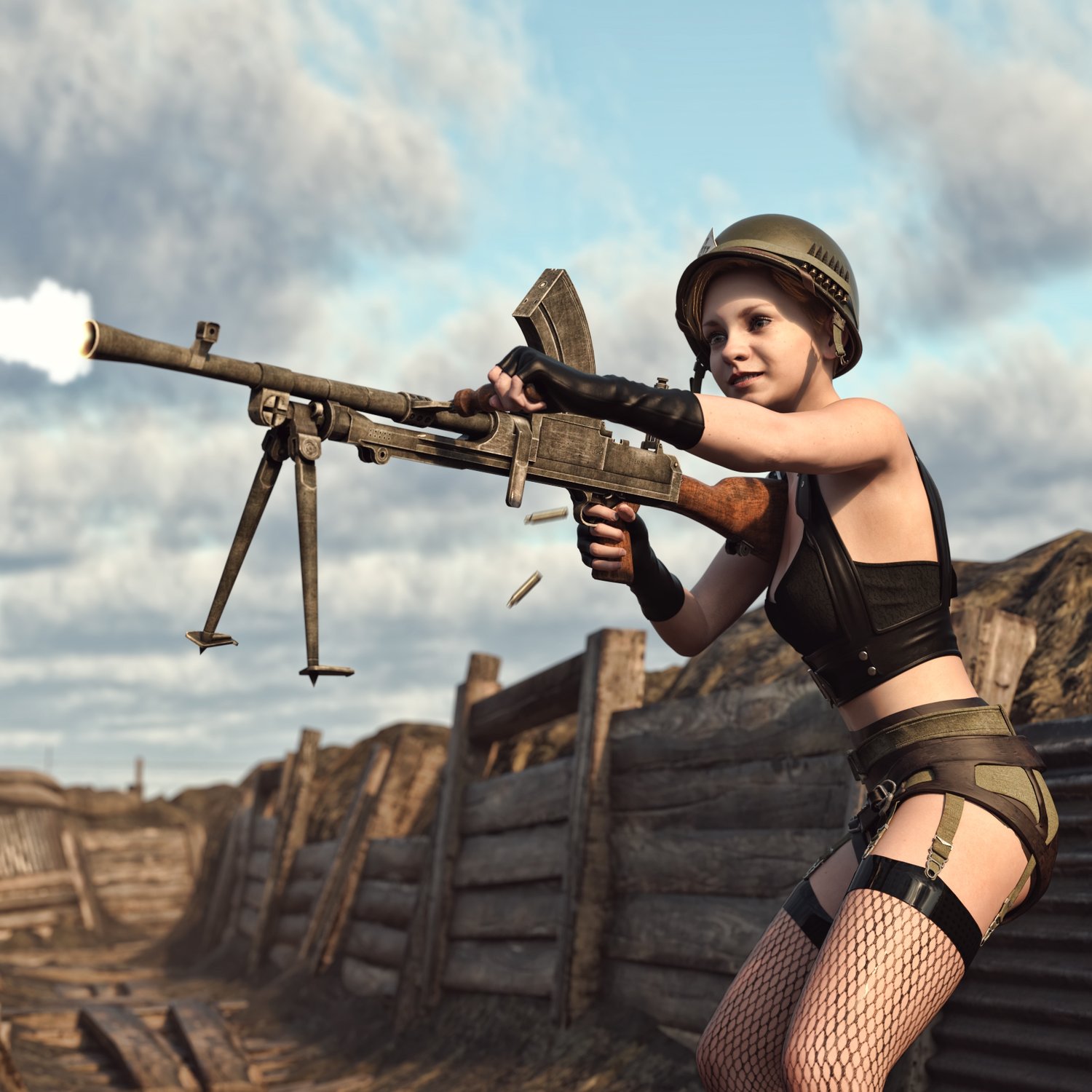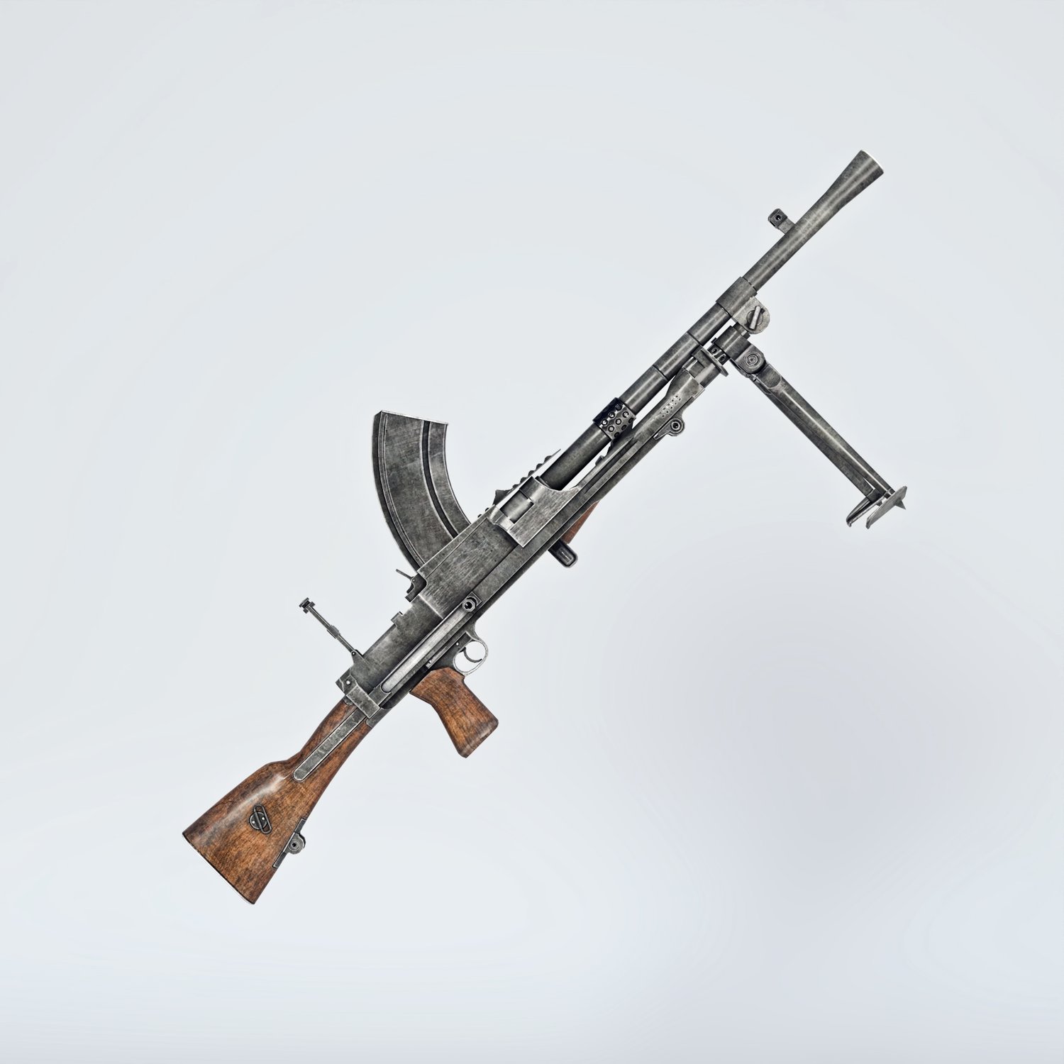 A famous BREN automatic rifle of WW2. Czech and British development. Sometimes confused with machinegun, but it's not exactly so. Yet the rifle was very effective, despite limited capacity of the magazine (though for the time and the role was very respectful). Includes a bipod that can be articulated or hidden. The prop is rigged and converted for use with DAZ. Trigger, Bipod etc also rigged for more realistic pictures.