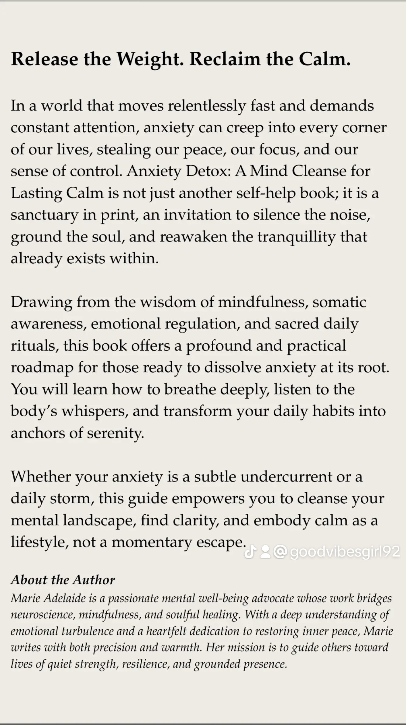 Through a rich blend of neuroscience, mindfulness, breathwork, emotional cleansing, and daily grounding rituals, Marie Adelaide offers a complete method to: