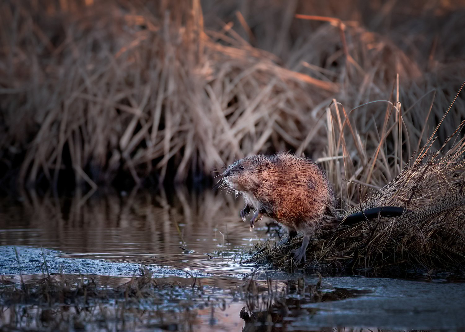 Muskrat (Ondatra zibethicus) the lake. In the reddish evening light. Iidesjärvi Tampere Finland.