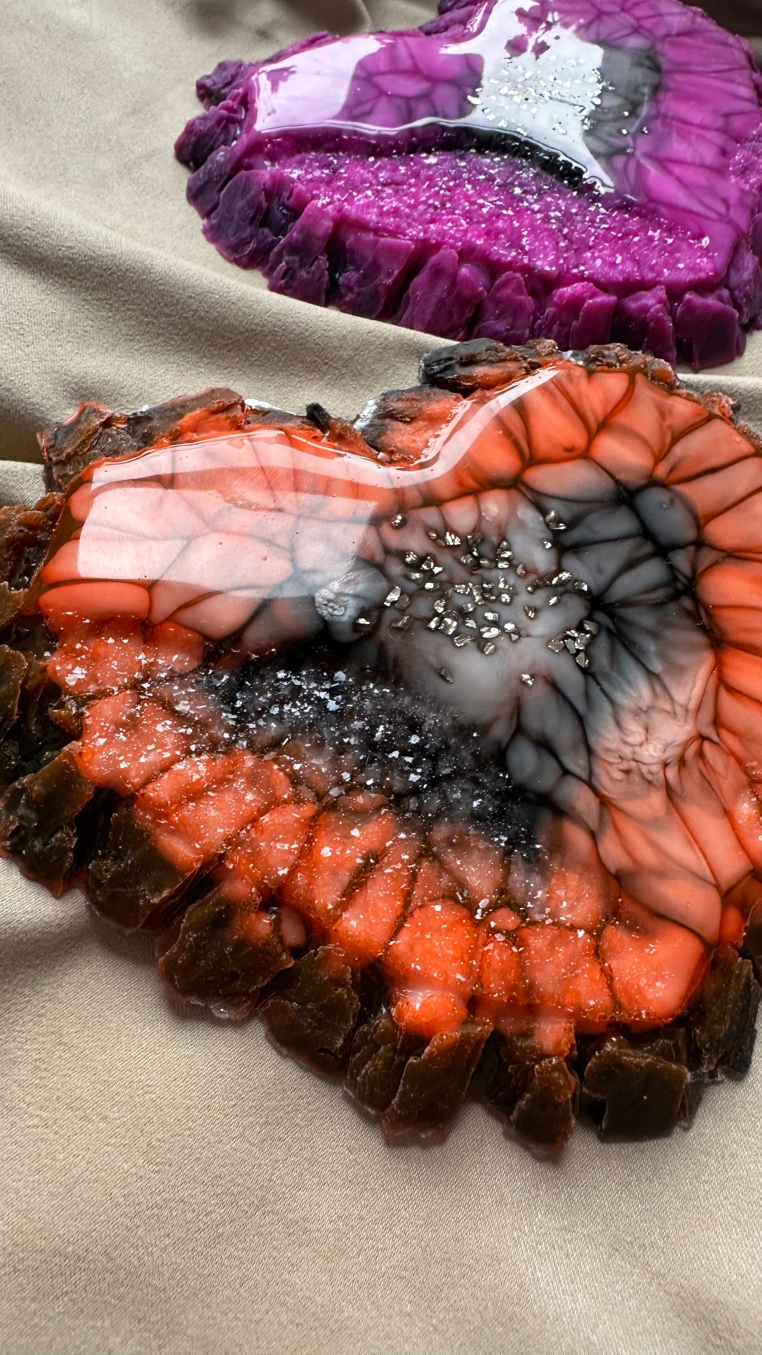 A striking heart-shaped coaster inspired by the beauty of natural crystals. Each piece is handmade, with unique color flow and shimmering accents that make it truly one of a kind.
