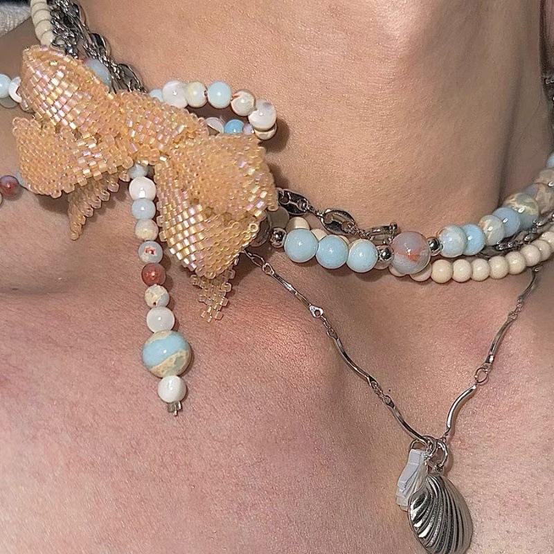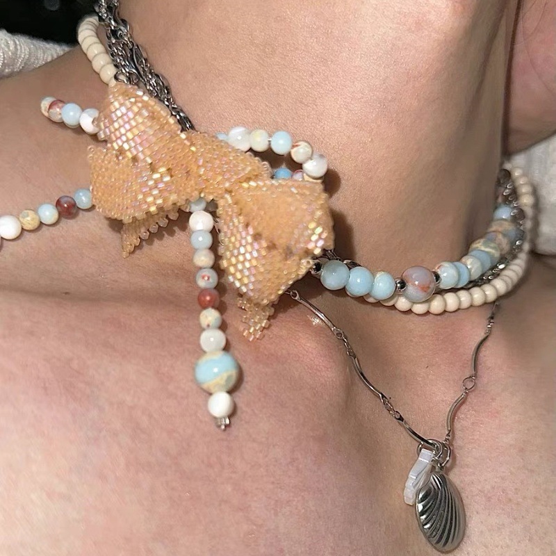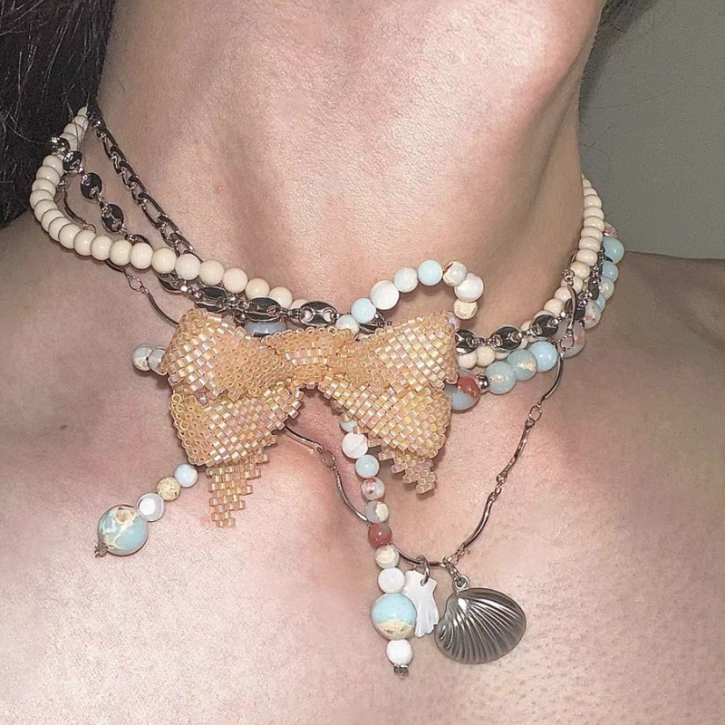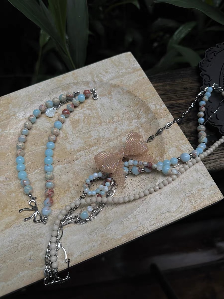 "Discord Elegance" Hand-beaded blue stone bow titanium steel multi-layered choker