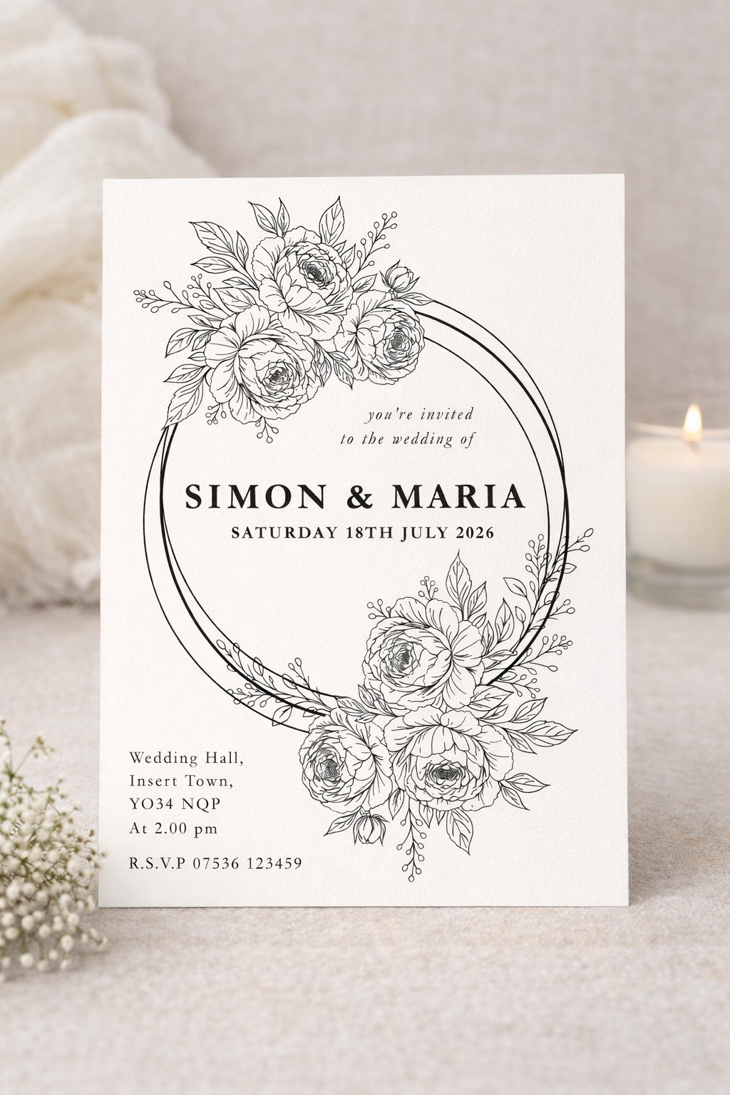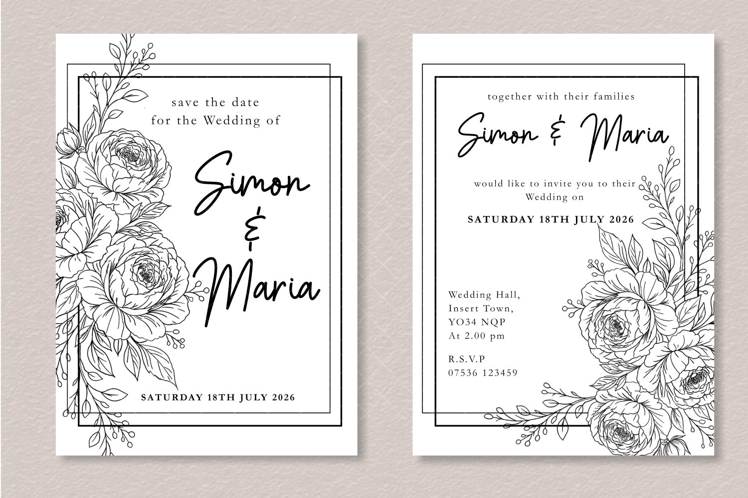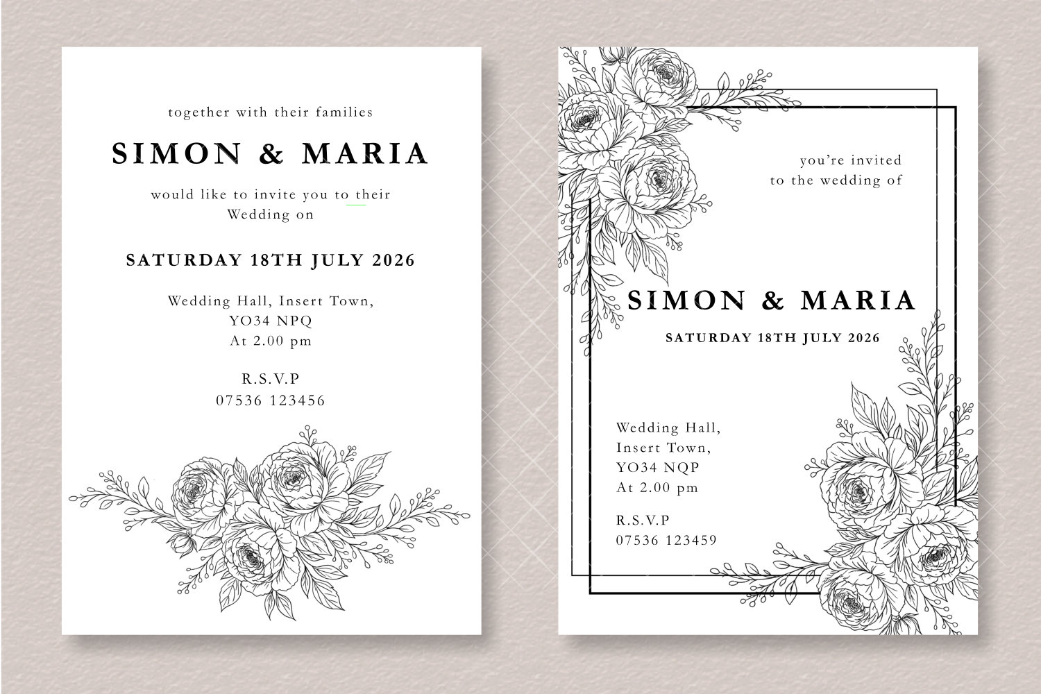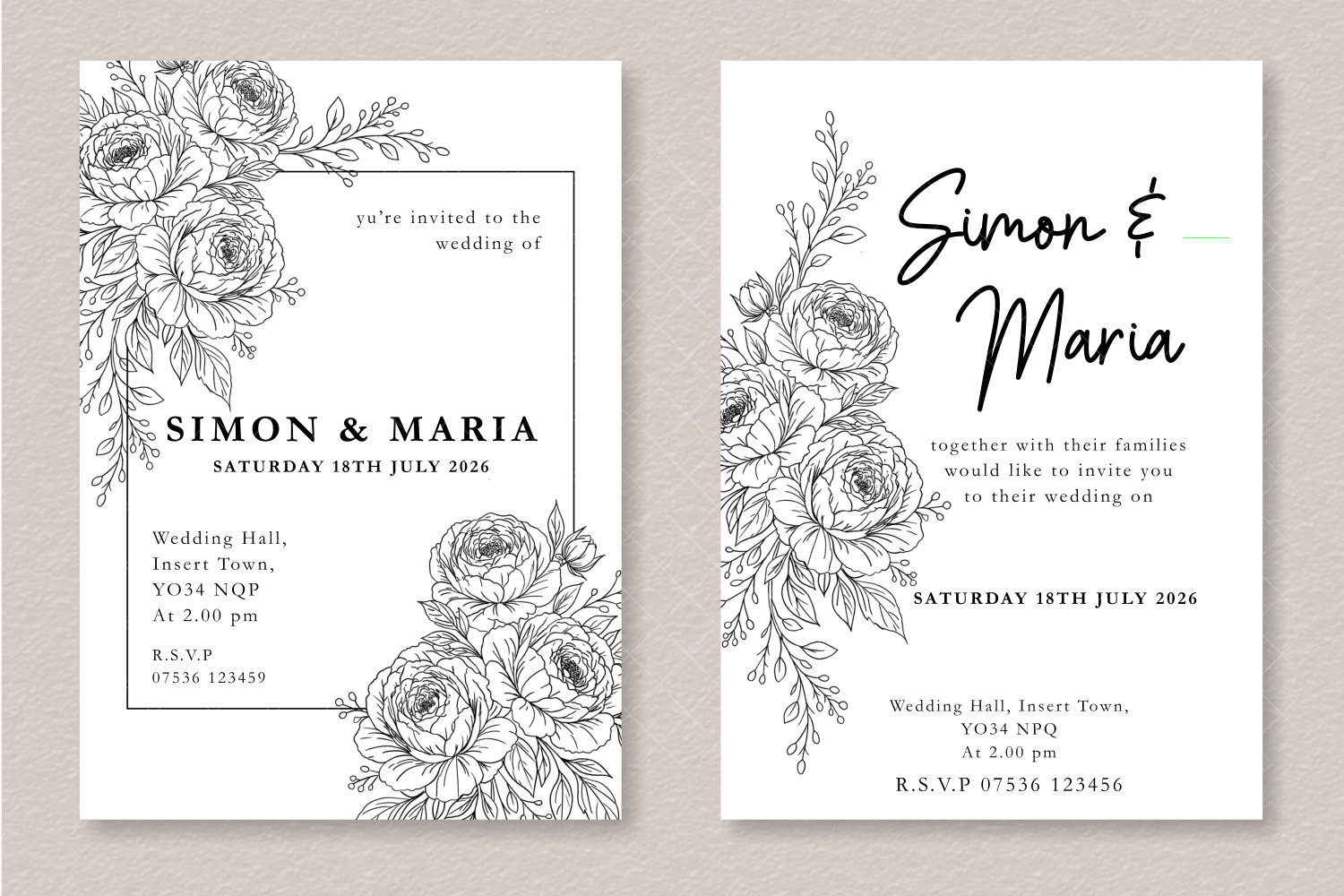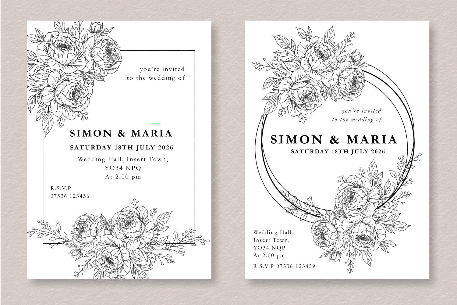 - Each design features elegant peony line art frames and floral arrangements perfect for invitation layouts.
