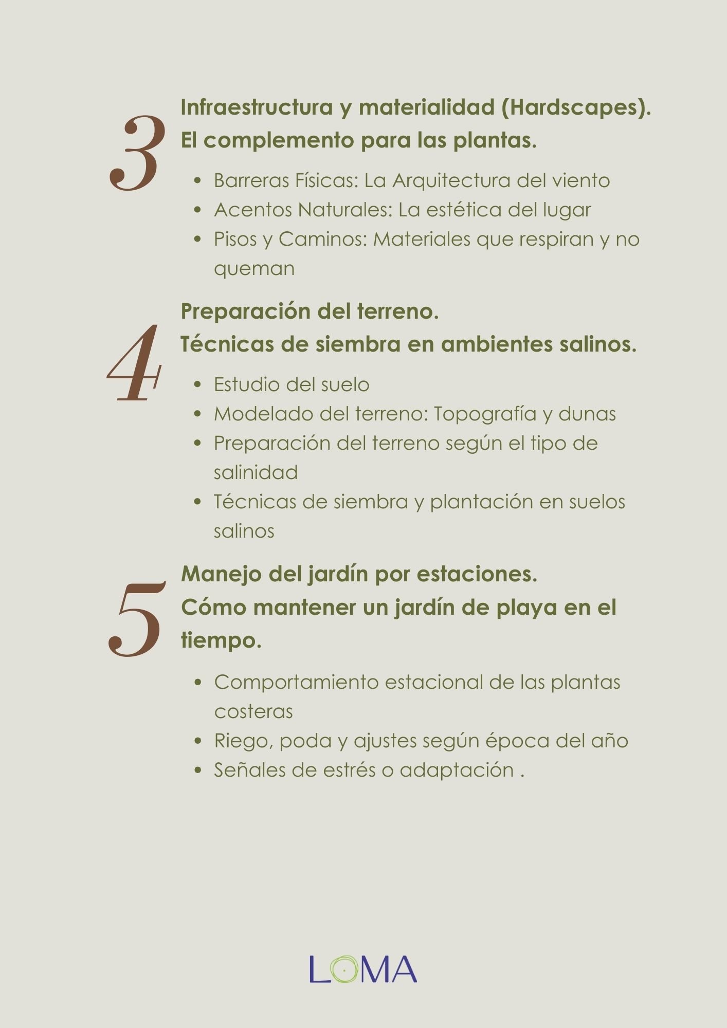 - Principios de infraestructura y materialidad (hardscape) adecuados para la costa.