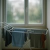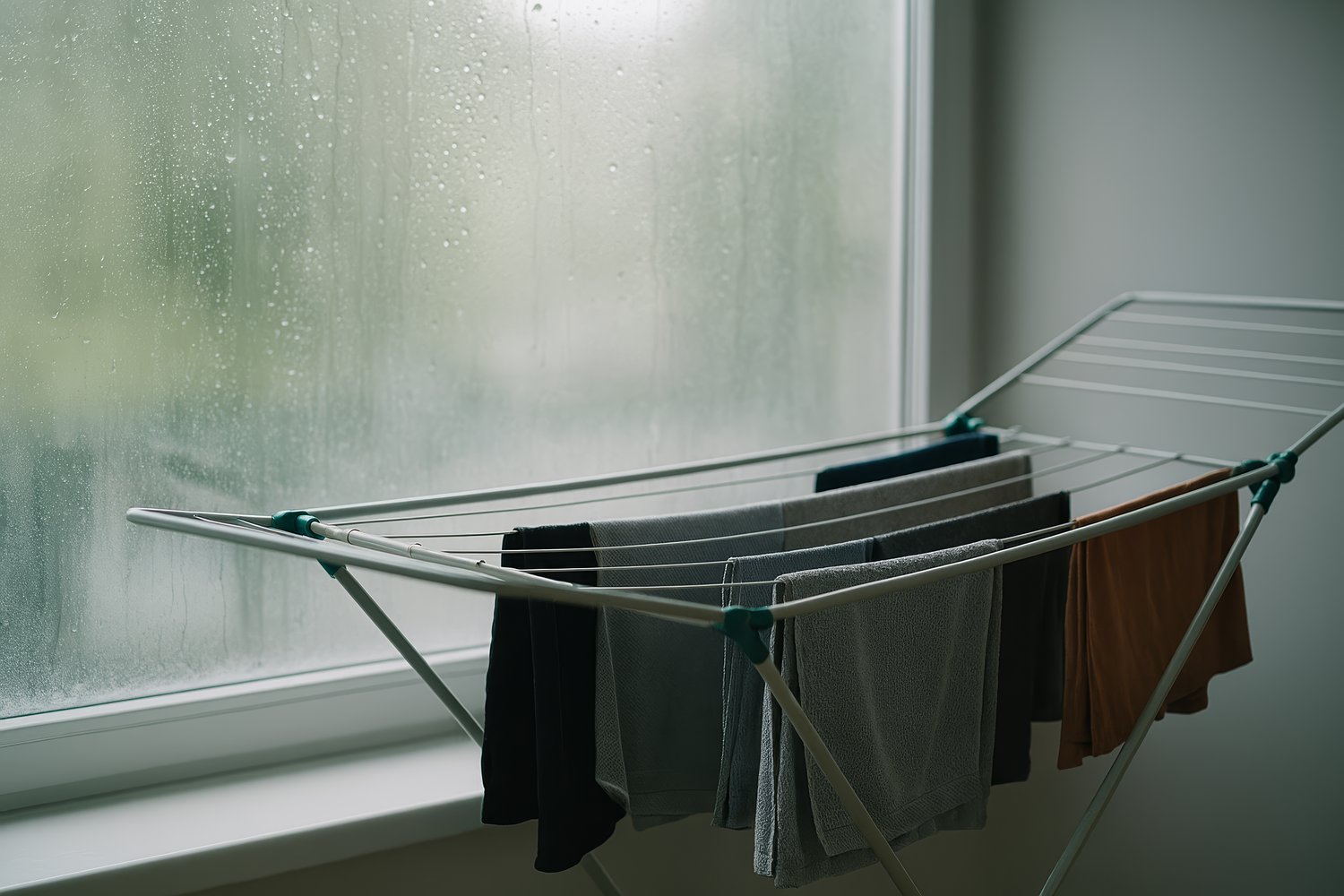 An indoor drying rack stands in front of a window streaked with rain, holding freshly washed clothes and towels. The soft daylight and muted colors create a peaceful, homely atmosphere, reflecting the quiet rhythm of domestic life on a rainy day.