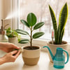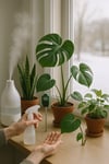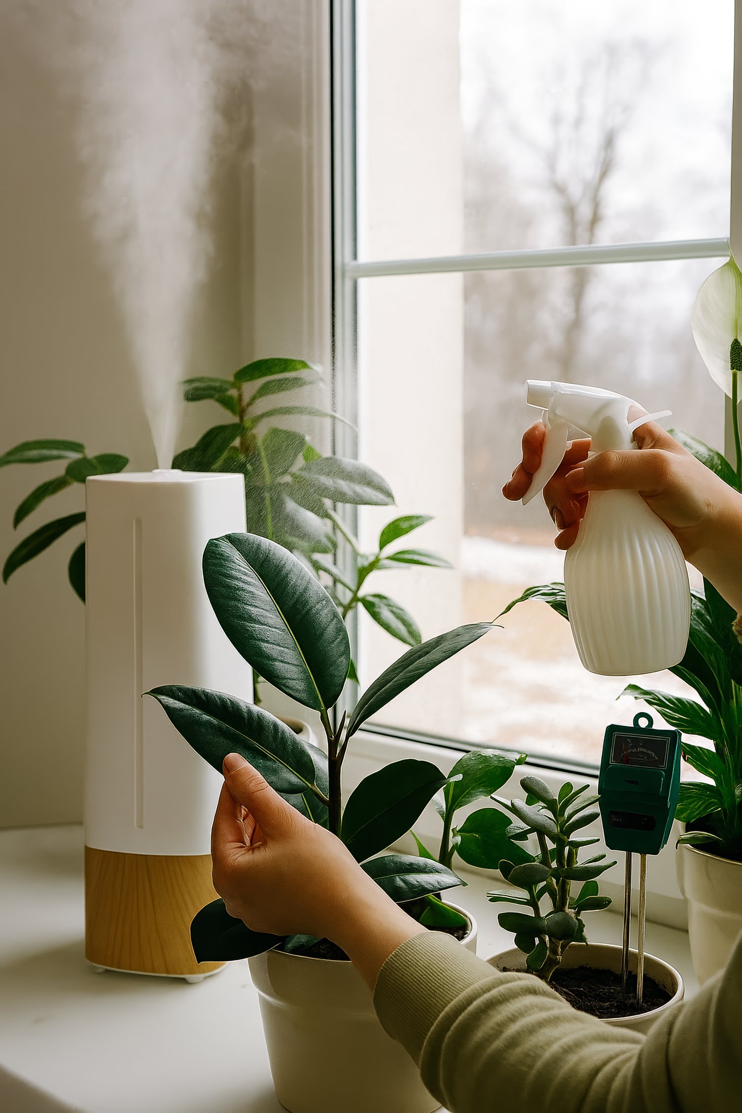 A black and white dog watches intently as a person wipes the leaves of a small houseplant by a window. Surrounded by plant care tools and framed by a snowy outdoor view, the scene captures a warm, peaceful moment of indoor care and companionship.
