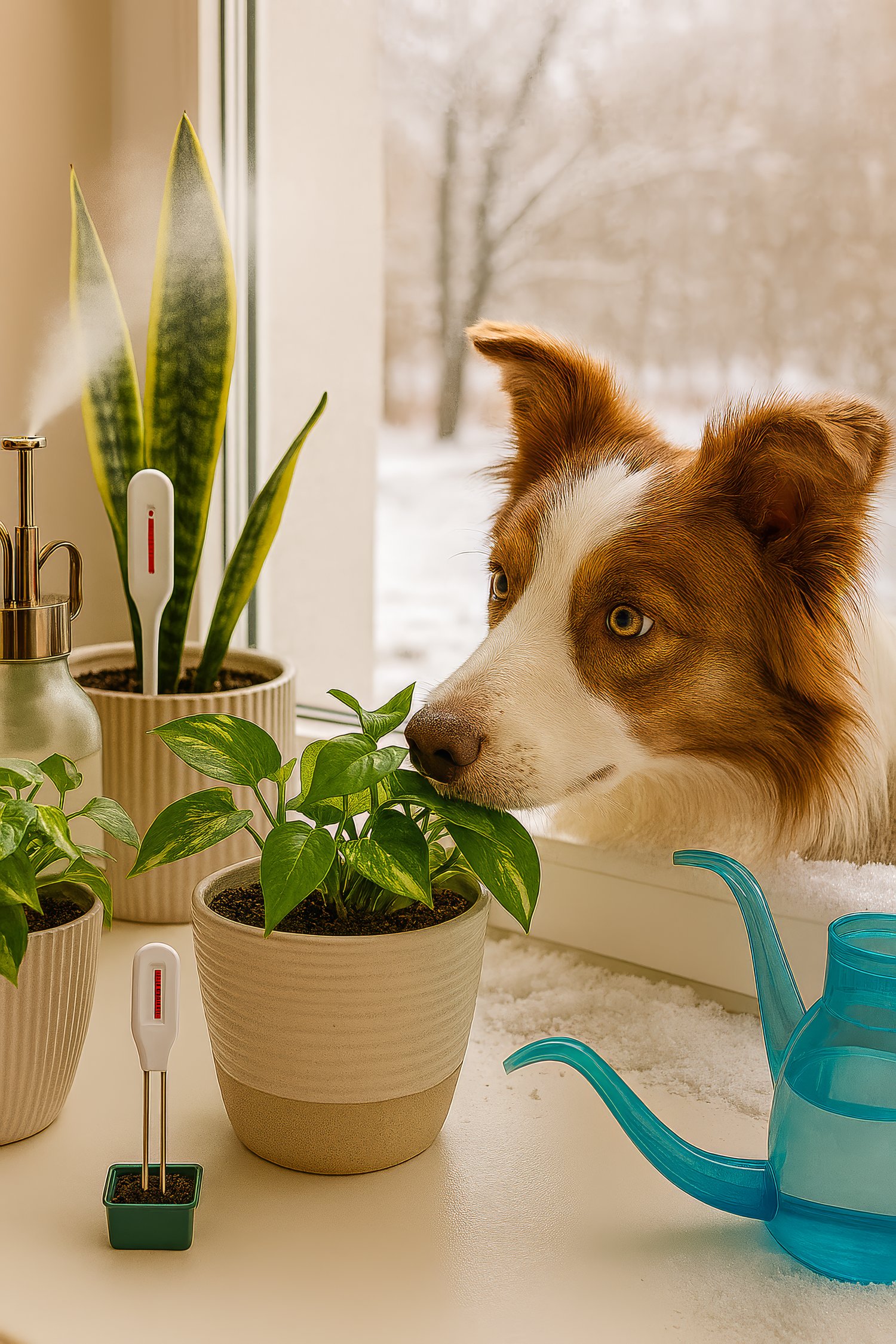 dog, plant, indoor, winter, houseplant, pet, windowsill, snow, cleaning, foliage, cozy, home, blackandwhite, animal, care, green, domestic, humidity, wateringcan, sponge, thermometer, lifestyle, nurturing, softlight, curious, plantcare, potted, environment, stilllife, cold, companion, cozyhome, interior, leaf, peaceful, nature