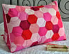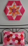 Love to read in bed, but end up with a sore back?? I designed this pillow specifically to be the support needed keep me comfortable while I read. There's even a handy pocket on one side to tuck reading glasses into! (Or use it to keep track of your IPod or MP3 player while you relax). Maybe you've wanted to try sewing hexagons, but have been intimidated by their shape. Fear them no more! My hexagons are easy to piece and I've sized the template so that you can cut your hexagons from pre-cuts, such as charm squares. All you need are 3 charm packs to complete the pieced panel of the pillow (which wraps completely around its wedge shape). Three charm packs + hexagons... inspired the name of my new favourite pillow. Give it a try and I bet it will be your favourite too!