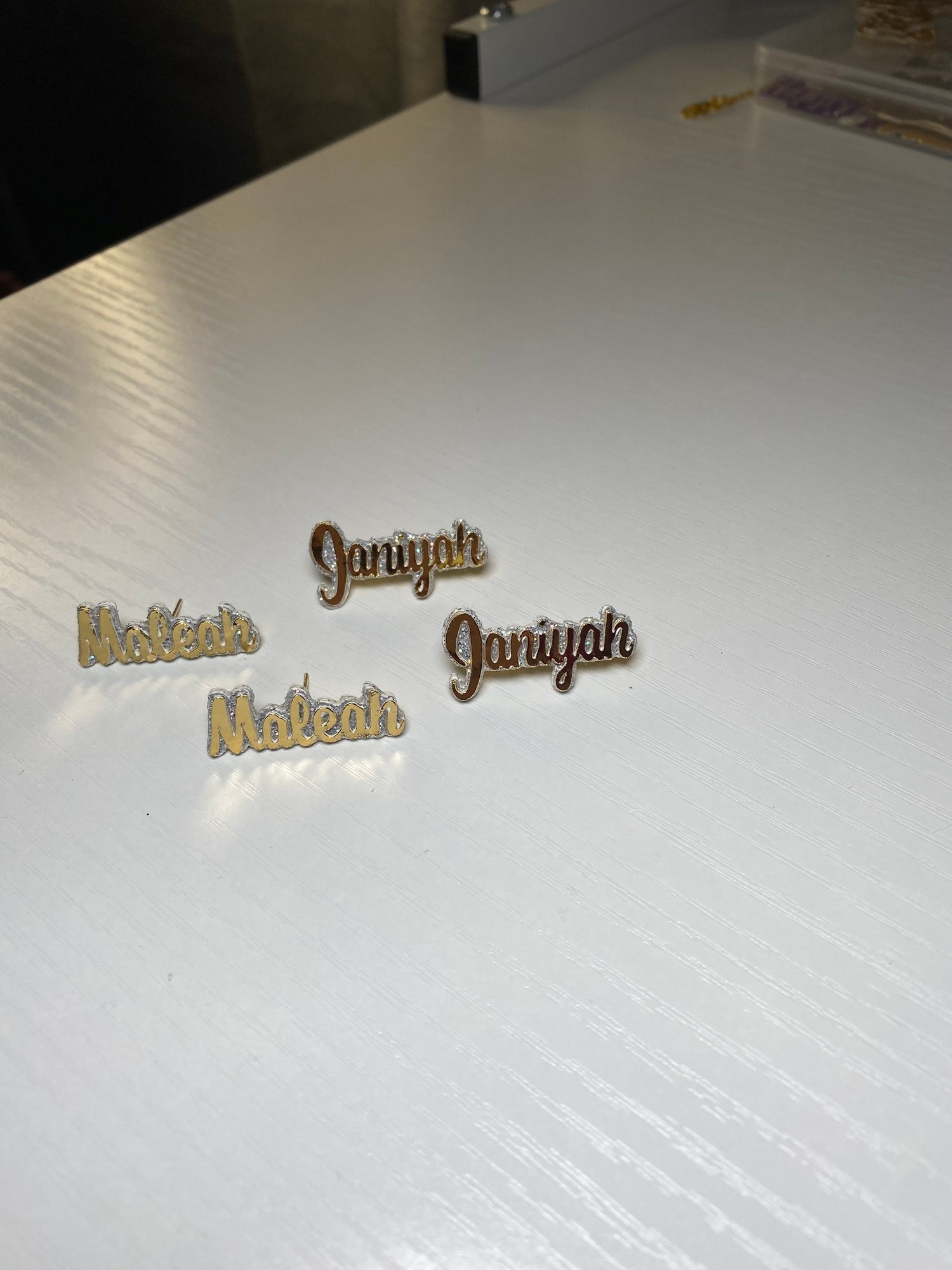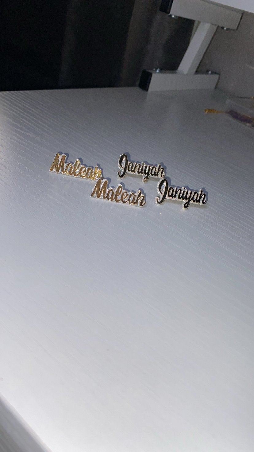 All Name Plates Are Made Out Of Heavy “Cardstock” Glued And Sealed With A Clear Coating To Ensure Longevity! (Earring Stems Are 14k gold Plated) Lead And Nickel Free. (NOTE SECTION) Please Include Child’s Name,& Color Background